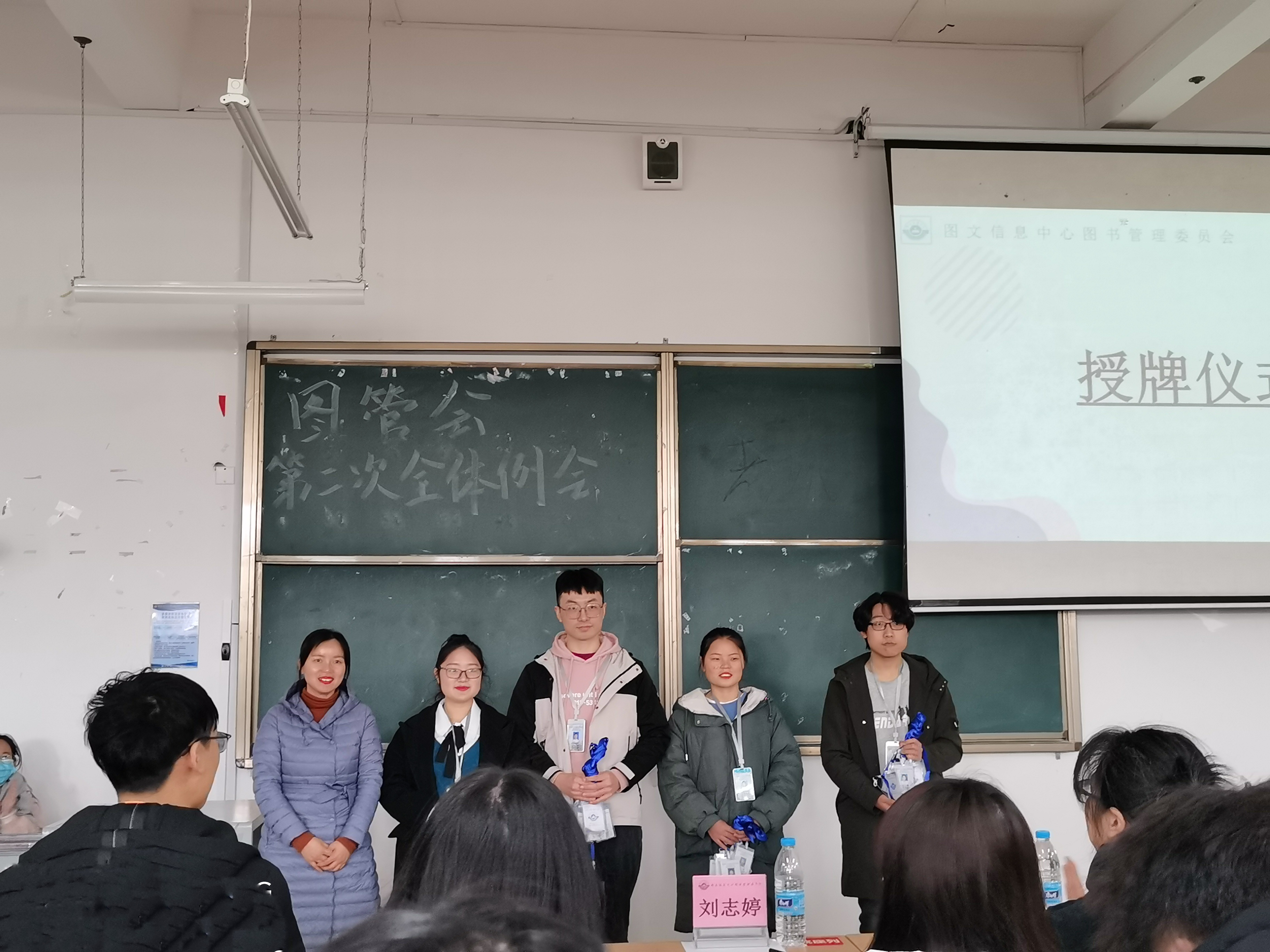 图文信息中心图书管理委员会(以下简称:“图管会”)继十月招新活动结束后,对所有新干事进行了为期一个月的严格考核。对于通过考核的同学,“图管会”于2020年12月4日在一栋教学楼1112教室举行了2020级新干事授牌仪式。