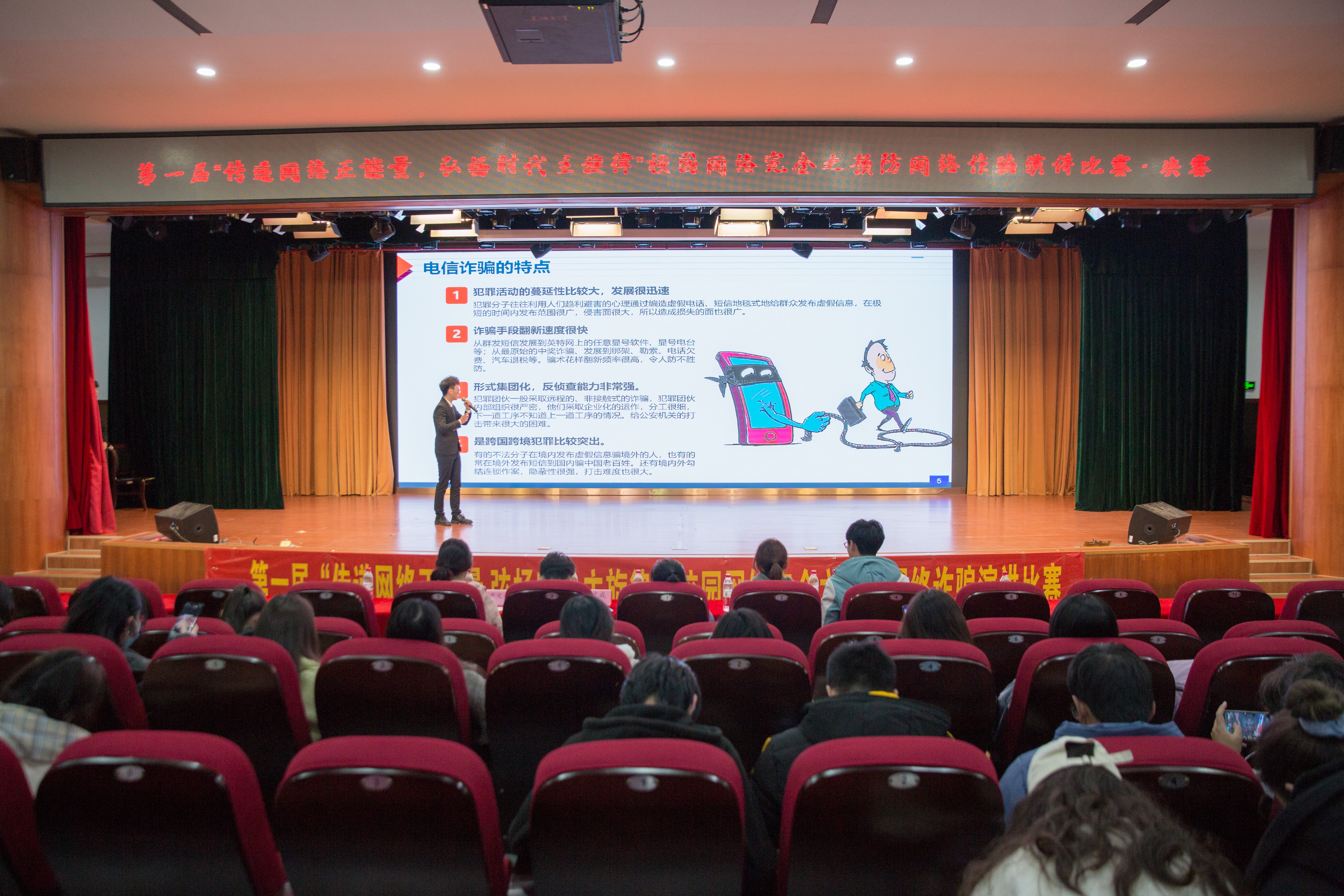 比赛过程中,参赛选手们以实际数据为例,利用PPT、视频及实际案例,以图文并茂的多种形式,将诈骗的种类、危害、主要特点、作案手法等融入演讲中,让同学们全方面的了解到了网络诈骗的手段和危害。