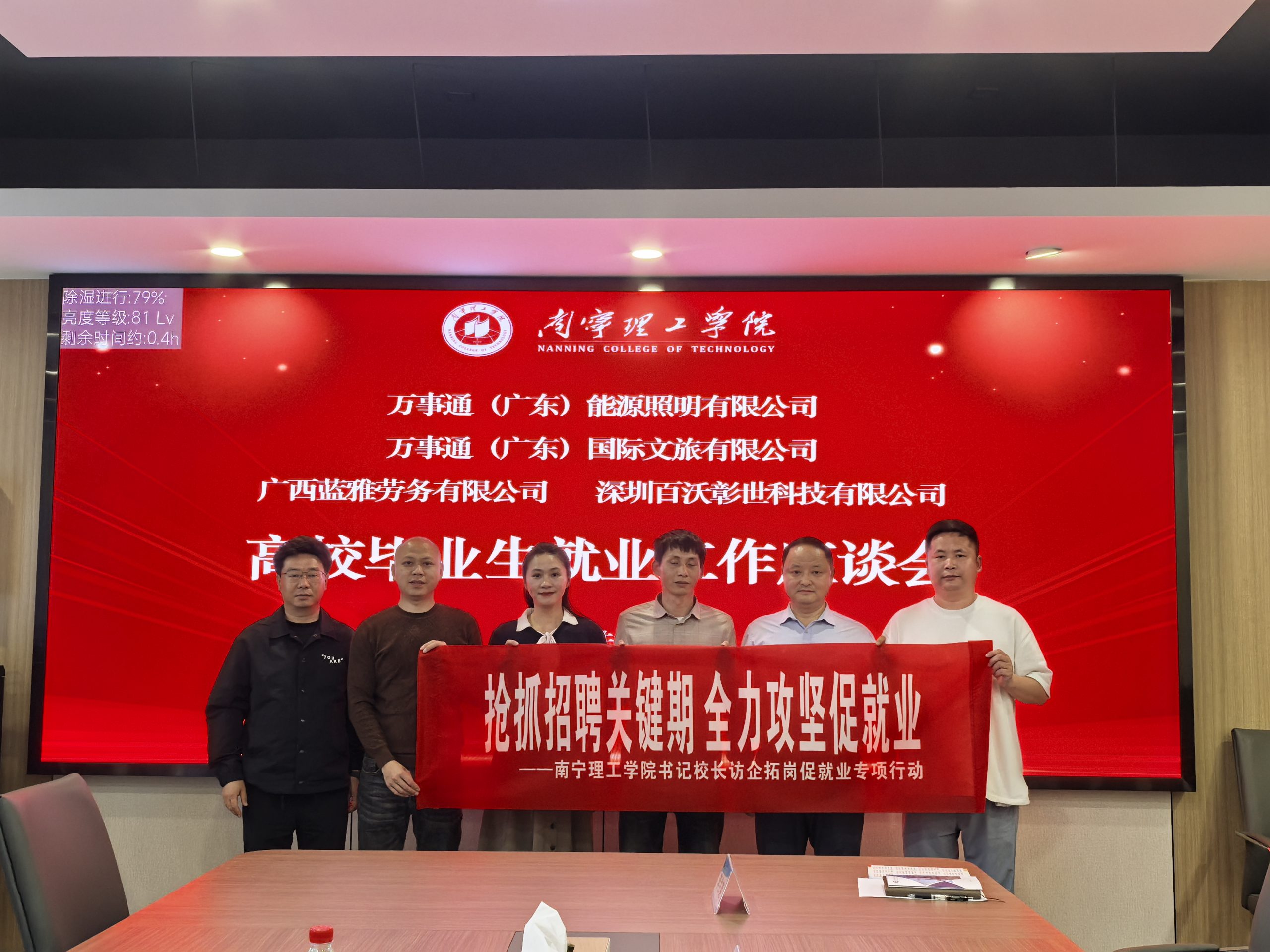 为积极响应教育部关于高校书记校长访企拓岗促就业专项行动的号召,深入落实党中央、国务院对高校毕业生就业工作的决策部署,2025年4月 27 日,南宁理工学院校长助理郑方兵,学生工作(部)处(部)处长李枚晏,信息工程学院党总支书记吴正平一行前往万事通(广东)能源照明有限公司以及万事通(广东)国际文旅有限公司,开展访企拓岗专项行动,进一步加强校企合作,拓宽毕业生实习与就业渠道,推动毕业生更充分、更高质量就业。