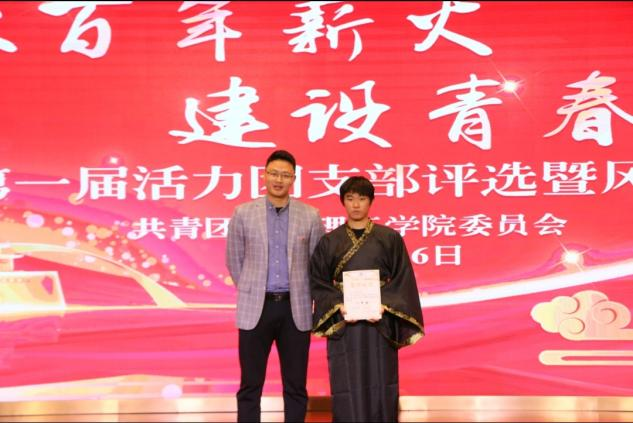 覃学鹏和纪雯娜老师为优胜者获奖团支部颁奖