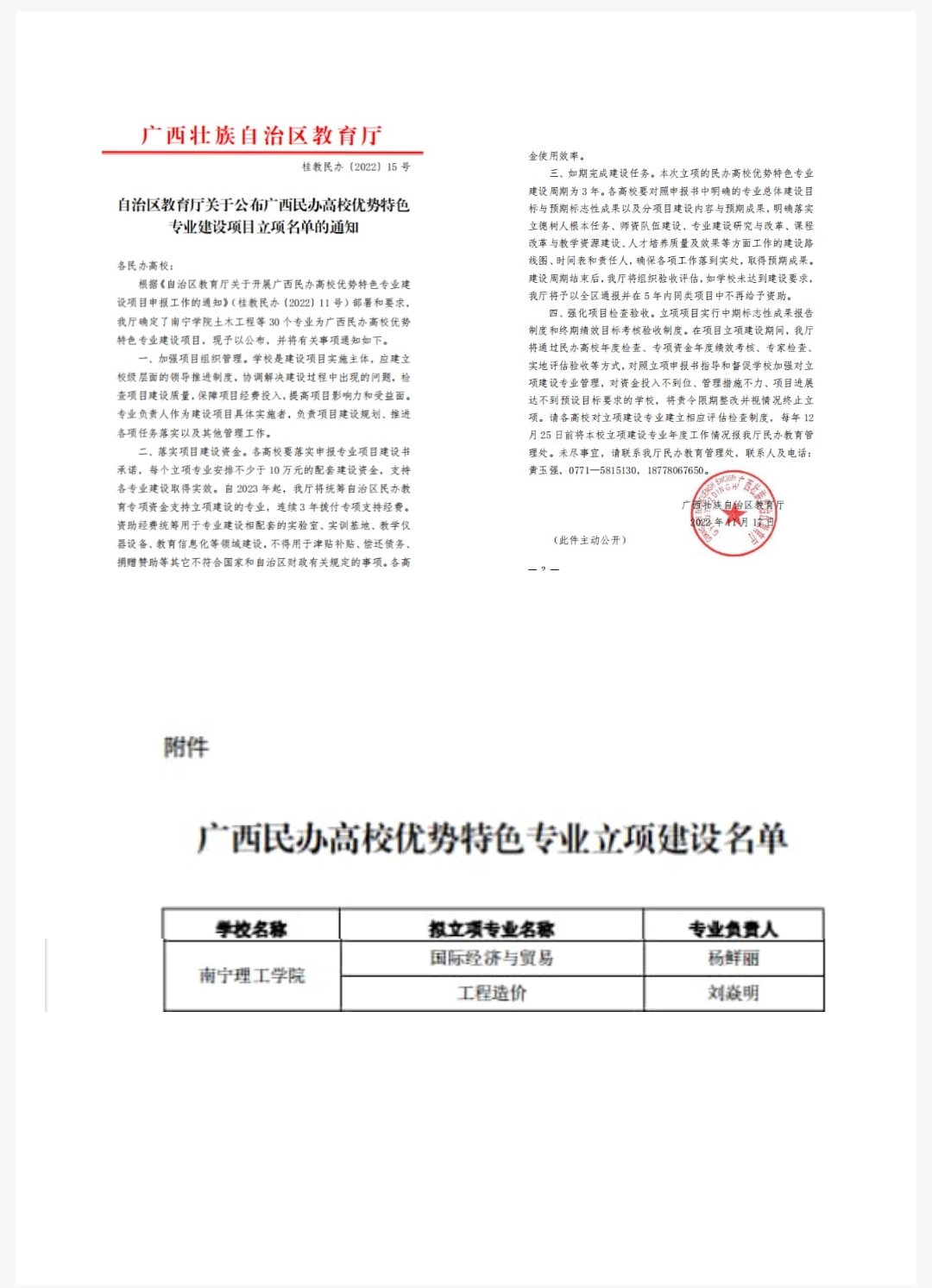 近日,自治区教育厅下发了《关于公布广西民办高校优势特色专业建设项目立项名单的通知》(桂教民办〔2022〕15号),我校国际经济与贸易(专业负责人:杨鲜丽)、工程造价(专业负责人:刘焱明)2个专业获批立项。