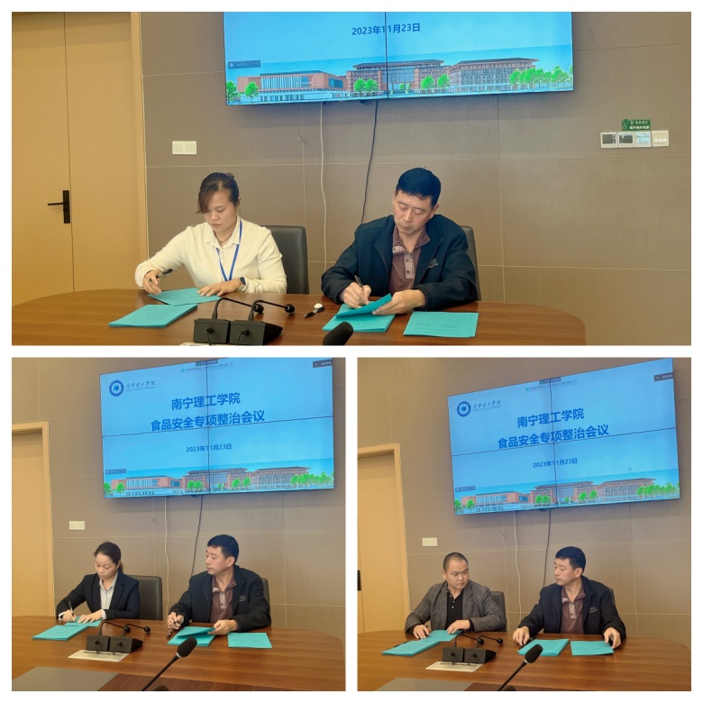 会上,商业餐饮办事处满文钊老师对11月学校食品安全管理管控排查中所发现的食品安全风险问题及整改措施等情况进行了通报。后勤保卫处处长助理王胜传达了《南宁理工学院食品安全专项整治行动实施方案》。学校食品安全总监、后勤保卫处处长钟木生与各经营单位签署了食品安全责任书,并对下一步食品安全工作做了部署安排:一要充分认识食品安全的重要性,进一步提高思想认识,将属地管理责任和经营单位主体责任贯穿到生产经营活动的各个环节,切实提高校园食品安全治理能力和保障水平;二要结合上级有关会议和文件精神,深入开展食品安全专项排查整治活动,立查立改,彻底整治安全隐患,并加强日常监督管理;三要加强校园食品安全相关政策法规的学习,严格贯彻落实各项食品安全要求。