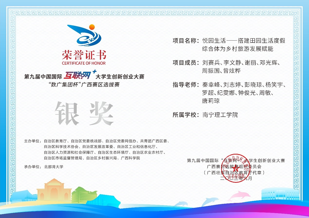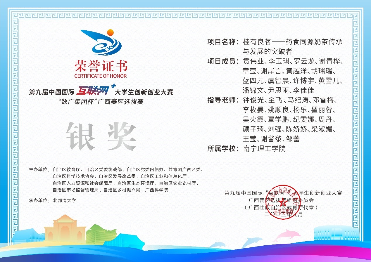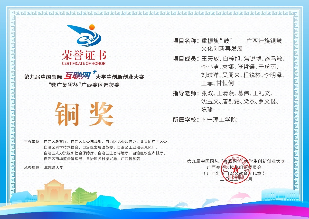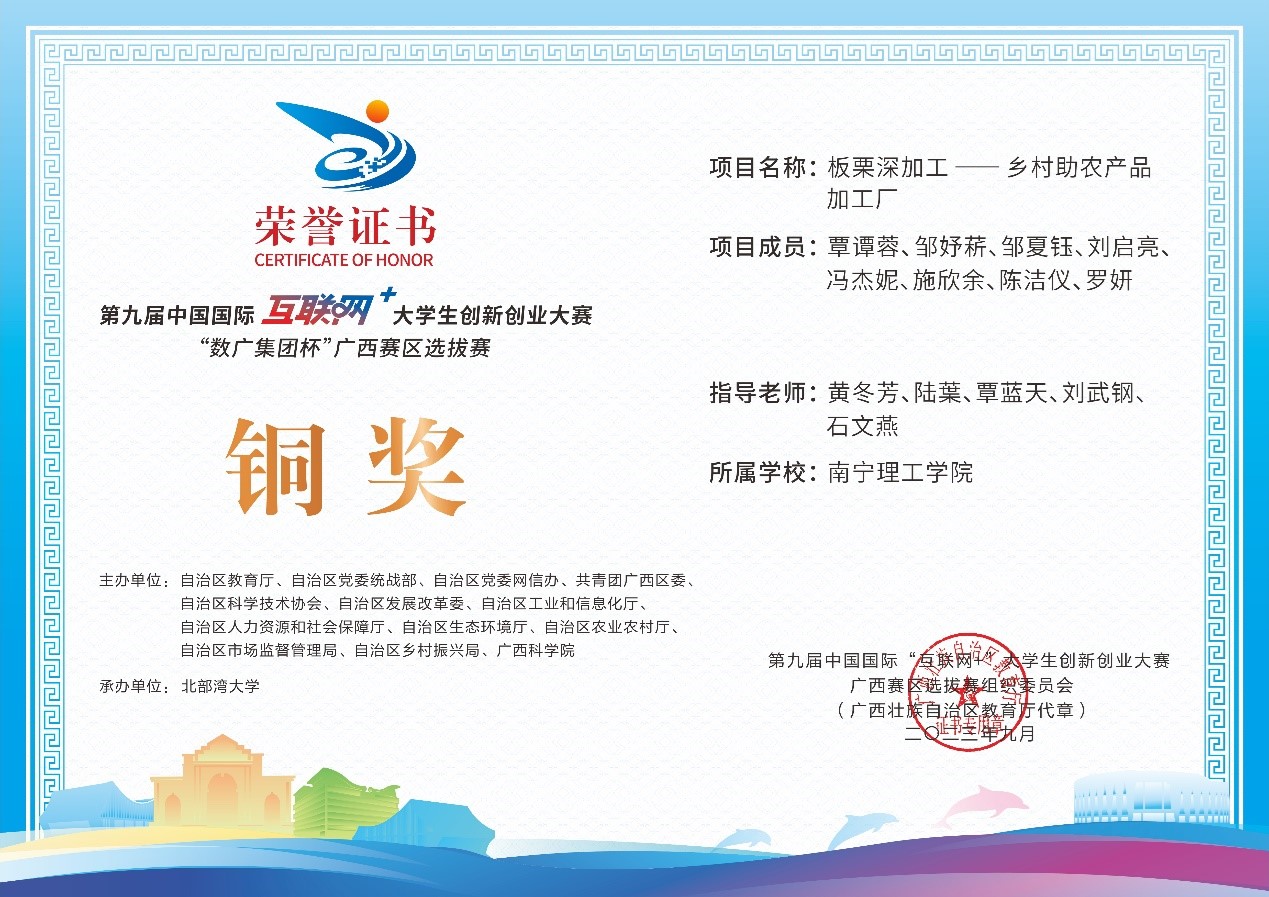 近日,第九届中国国际互联网+大学生创新创业大赛“数广集团杯”广西赛区选拔赛获奖奖状公布,我校参赛团队在高校主赛道中银奖2项,铜奖20项,红旅赛道中铜奖2项,共计24项。本届大赛以“我敢闯,我会创”为主题,大赛于今年8月全面启动。自开赛以来,南理学子以自己的专业知识和积极态度,凭借着自身的努力,突破重重障碍,荣获佳绩。