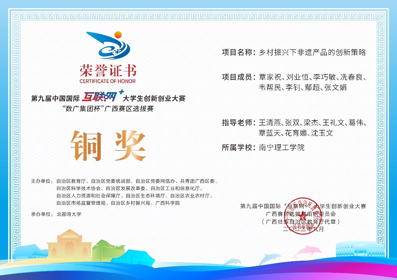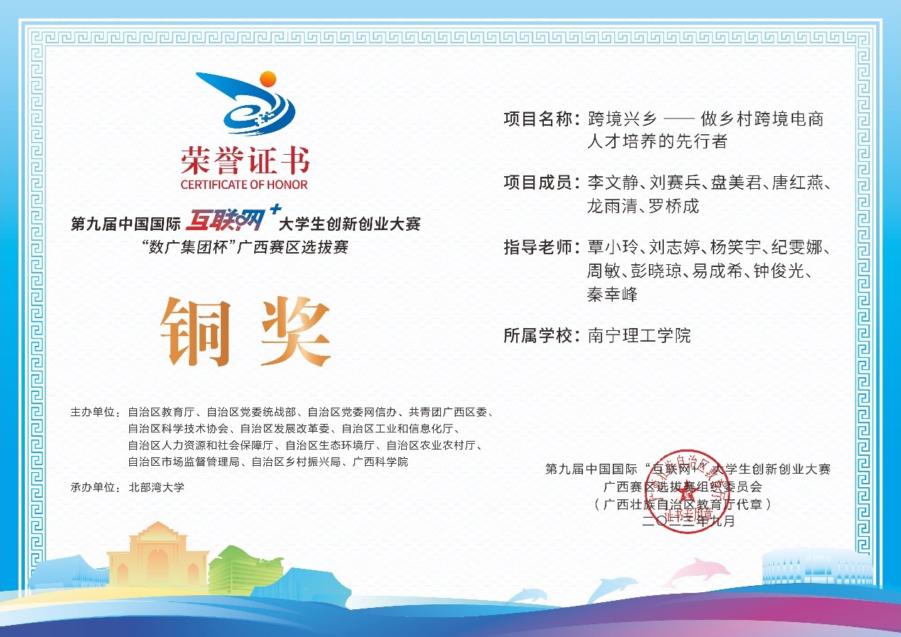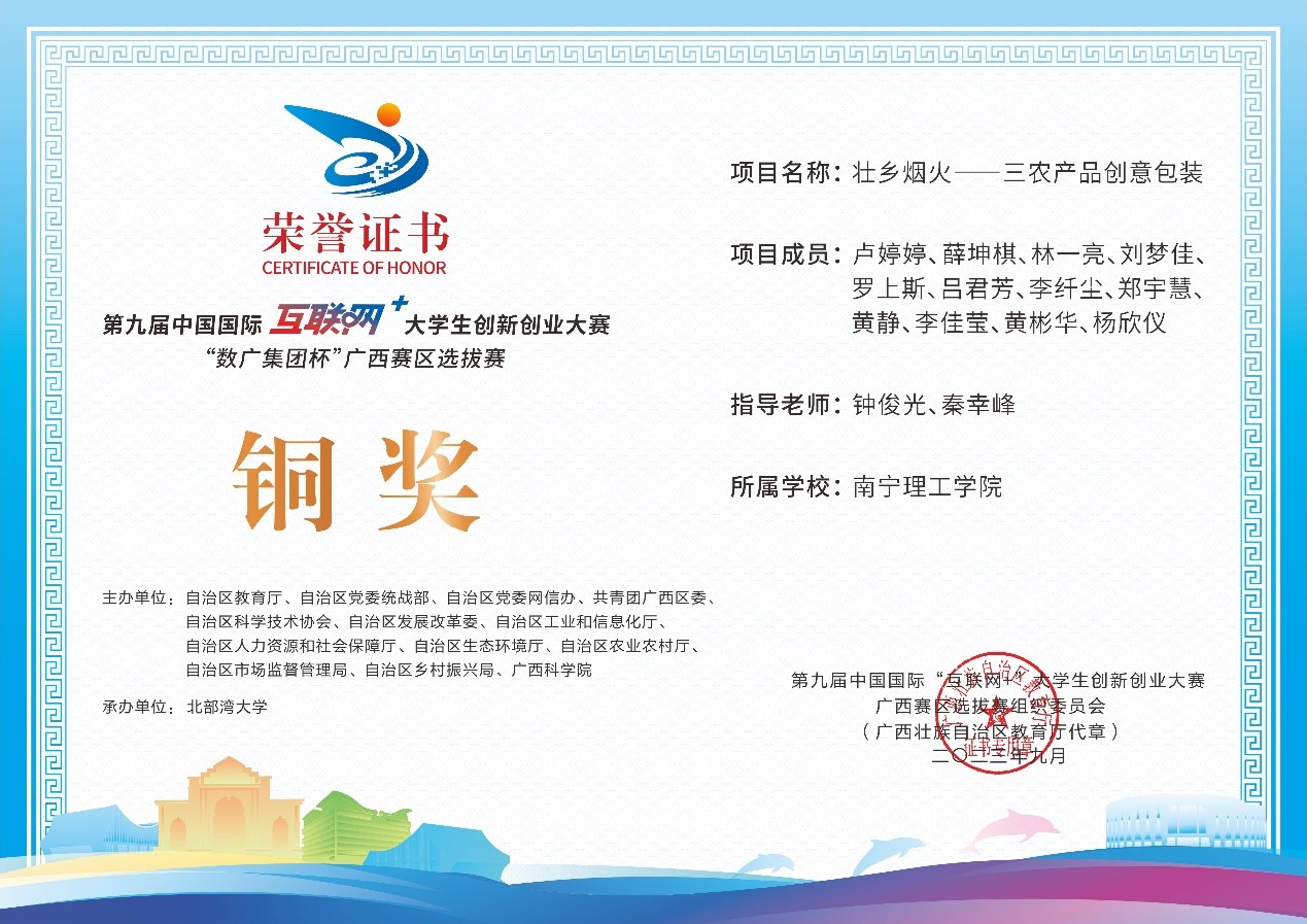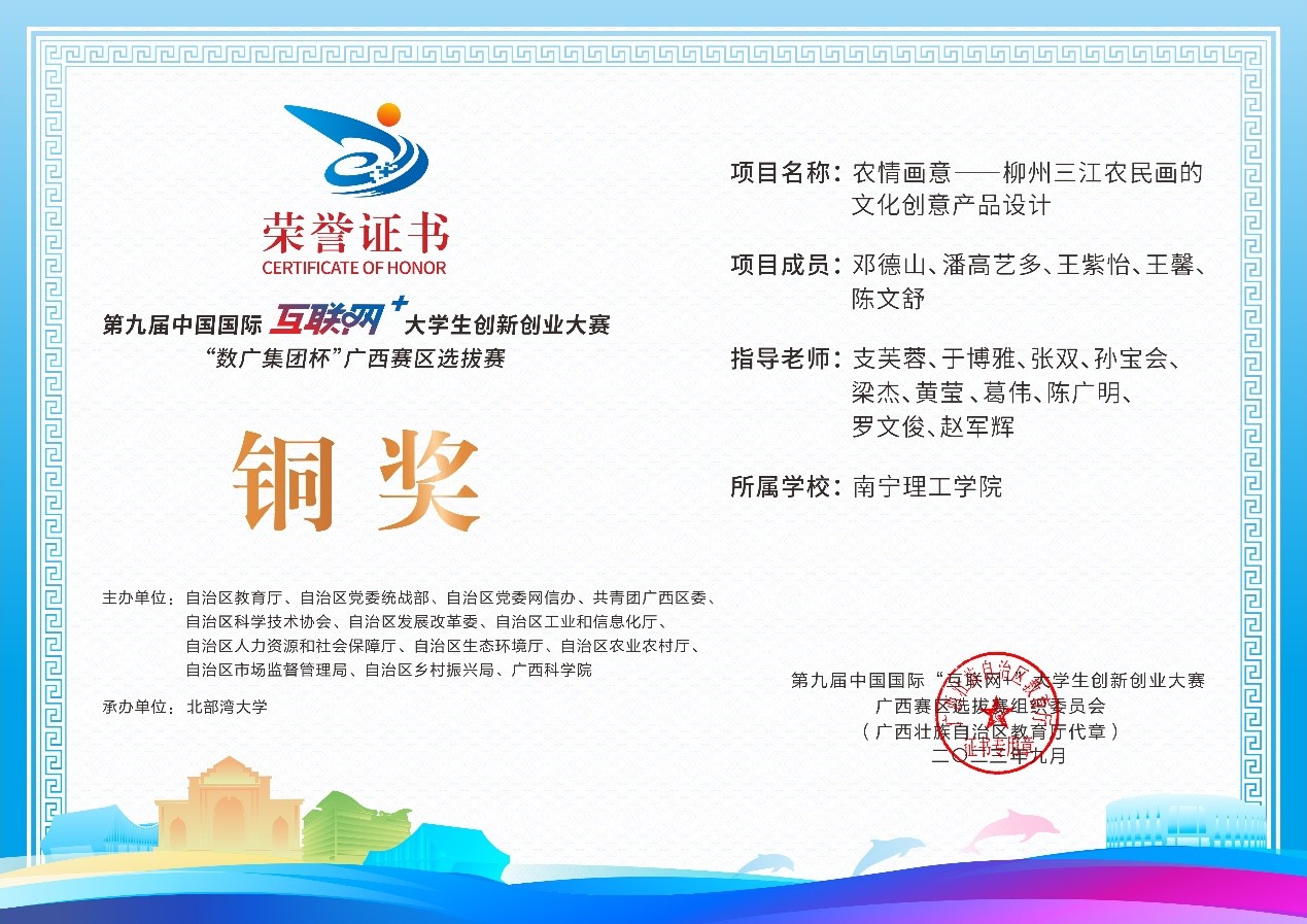 近日,第九届中国国际互联网+大学生创新创业大赛“数广集团杯”广西赛区选拔赛获奖奖状公布,我校参赛团队在高校主赛道中银奖2项,铜奖20项,红旅赛道中铜奖2项,共计24项。本届大赛以“我敢闯,我会创”为主题,大赛于今年8月全面启动。自开赛以来,南理学子以自己的专业知识和积极态度,凭借着自身的努力,突破重重障碍,荣获佳绩。