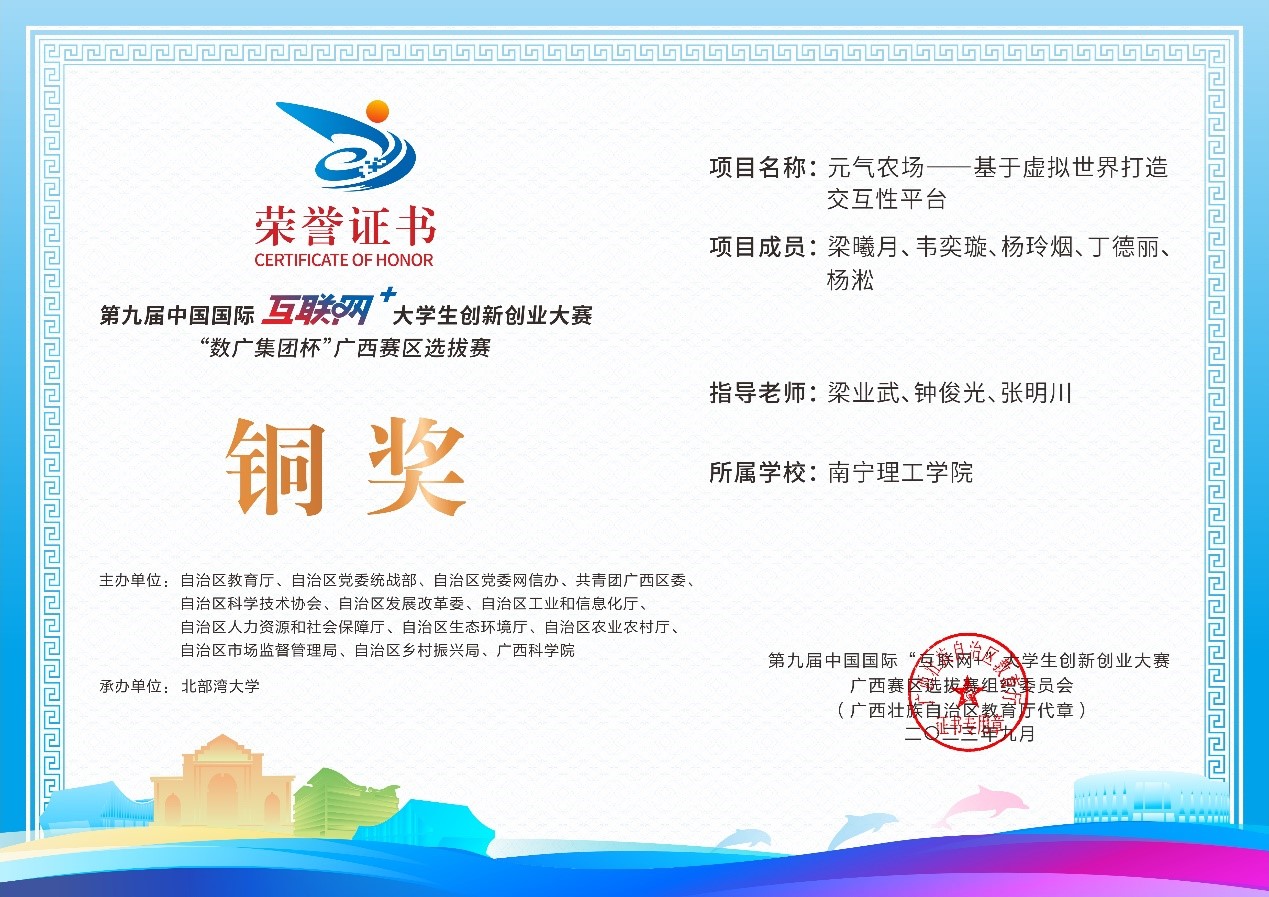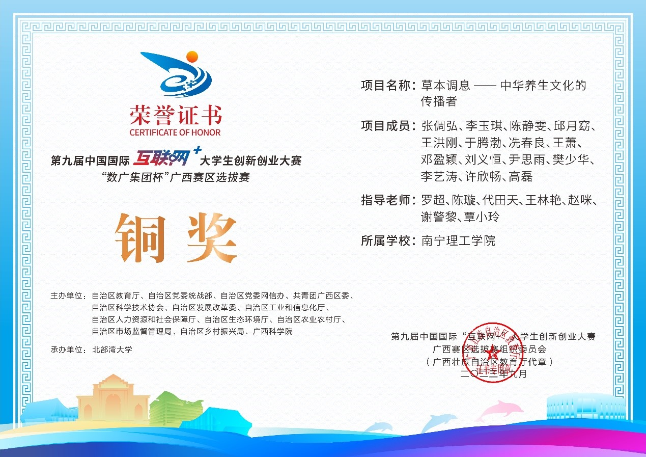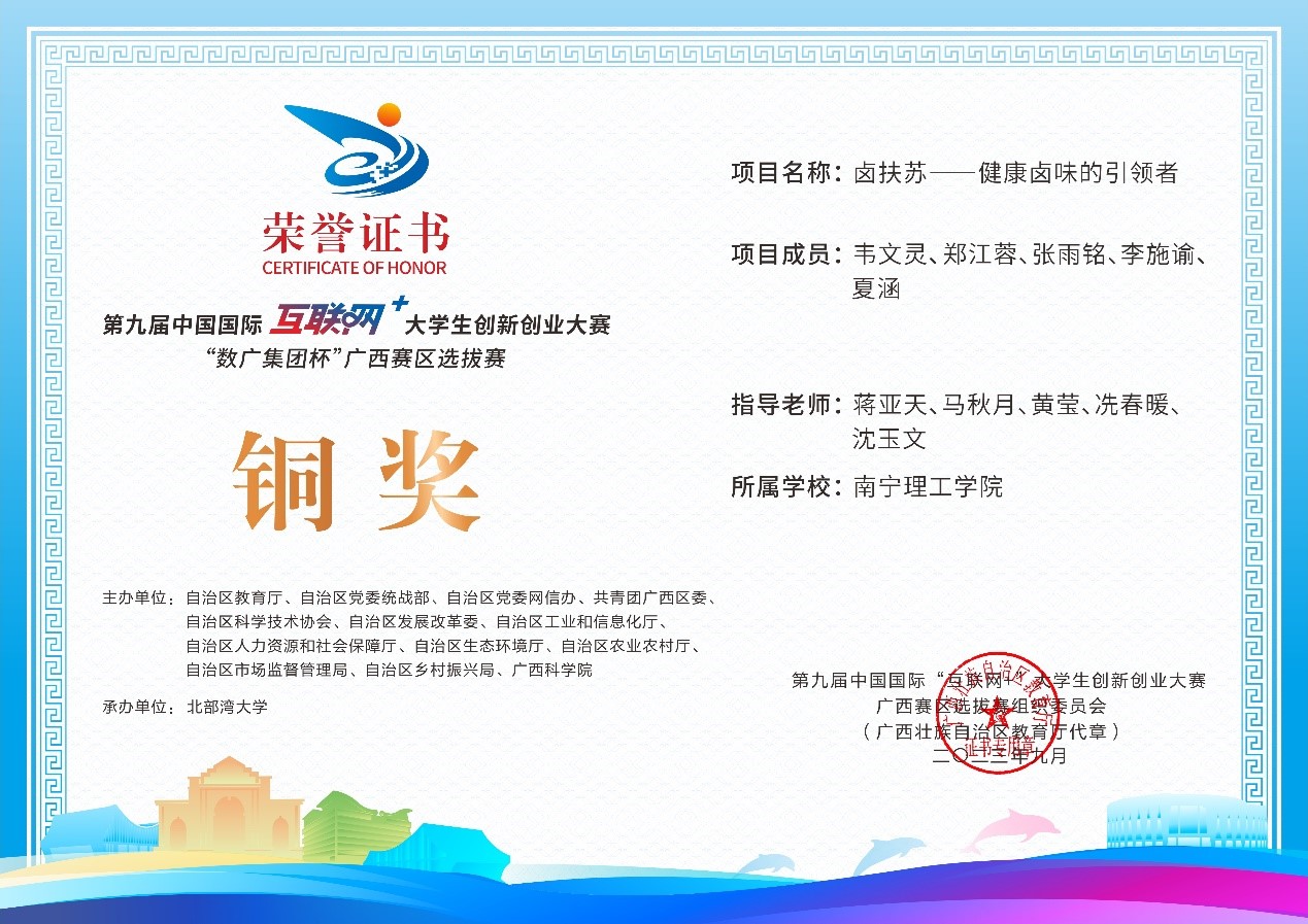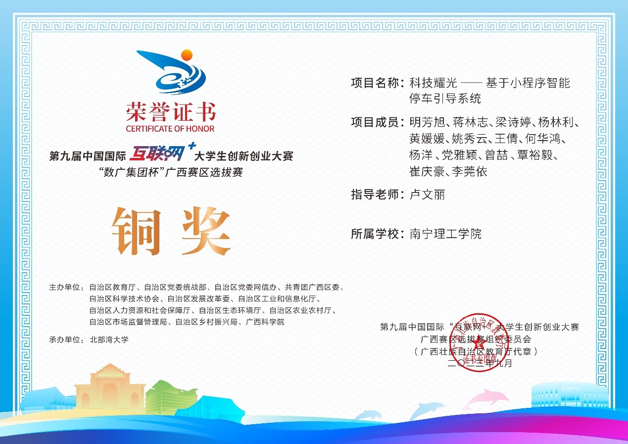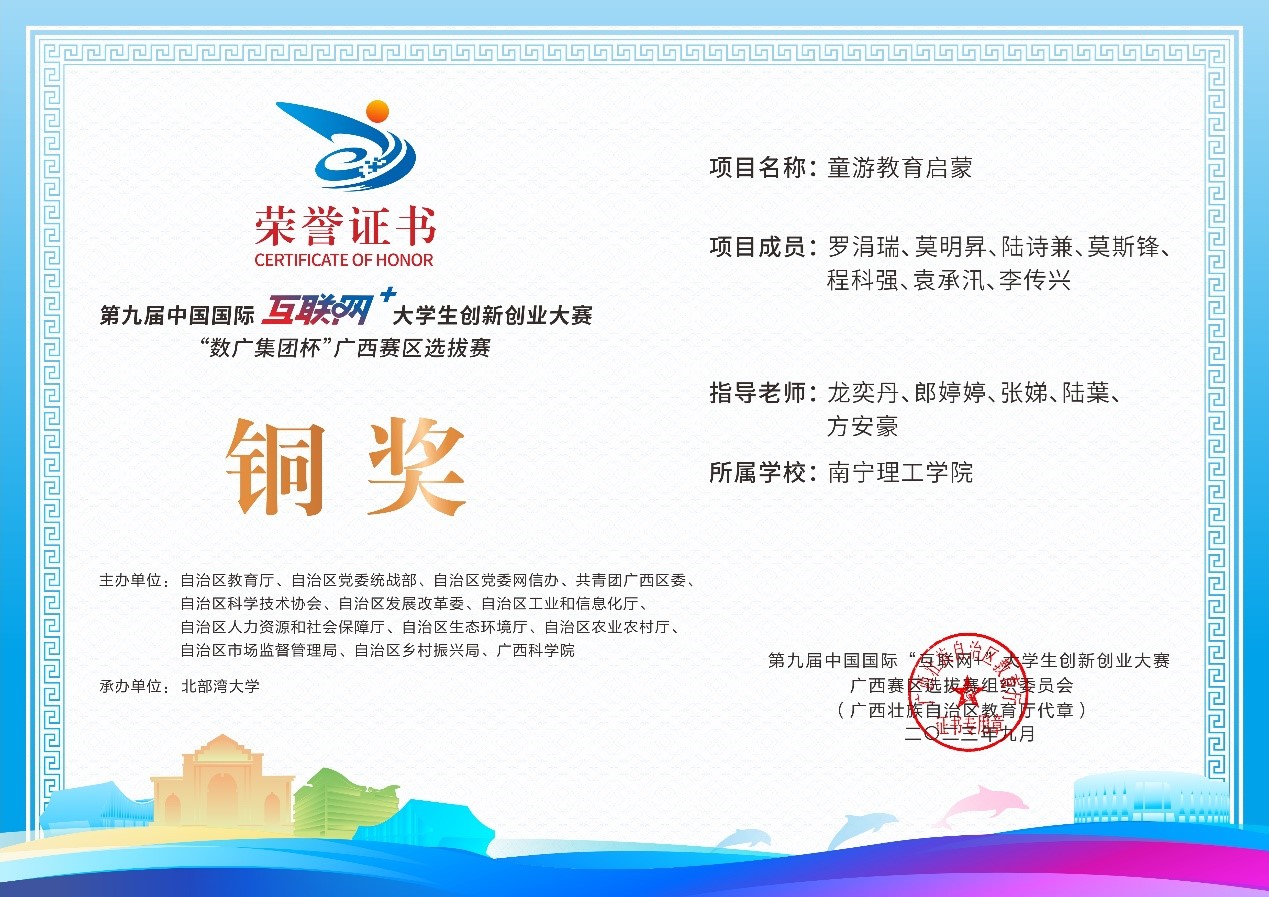 近日,第九届中国国际互联网+大学生创新创业大赛“数广集团杯”广西赛区选拔赛获奖奖状公布,我校参赛团队在高校主赛道中银奖2项,铜奖20项,红旅赛道中铜奖2项,共计24项。本届大赛以“我敢闯,我会创”为主题,大赛于今年8月全面启动。自开赛以来,南理学子以自己的专业知识和积极态度,凭借着自身的努力,突破重重障碍,荣获佳绩。