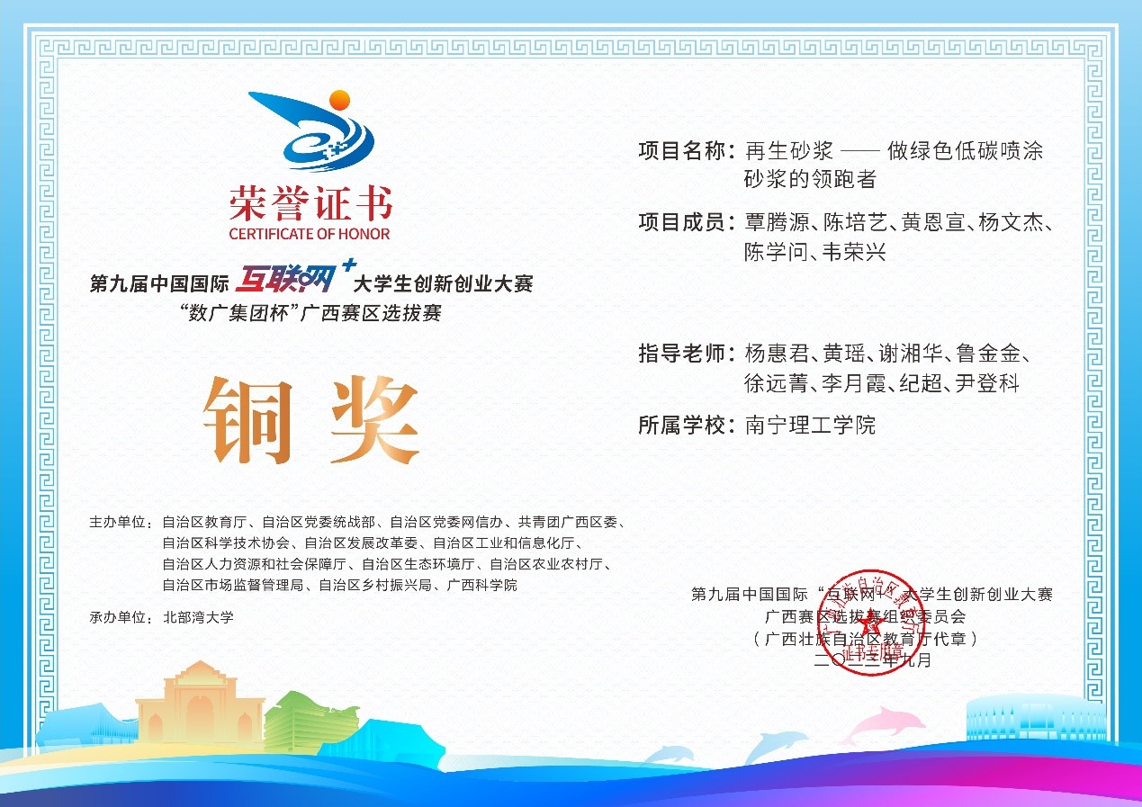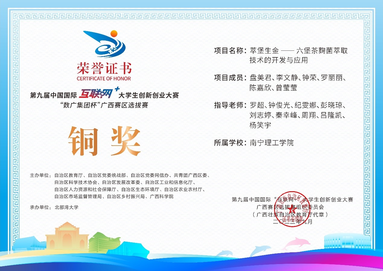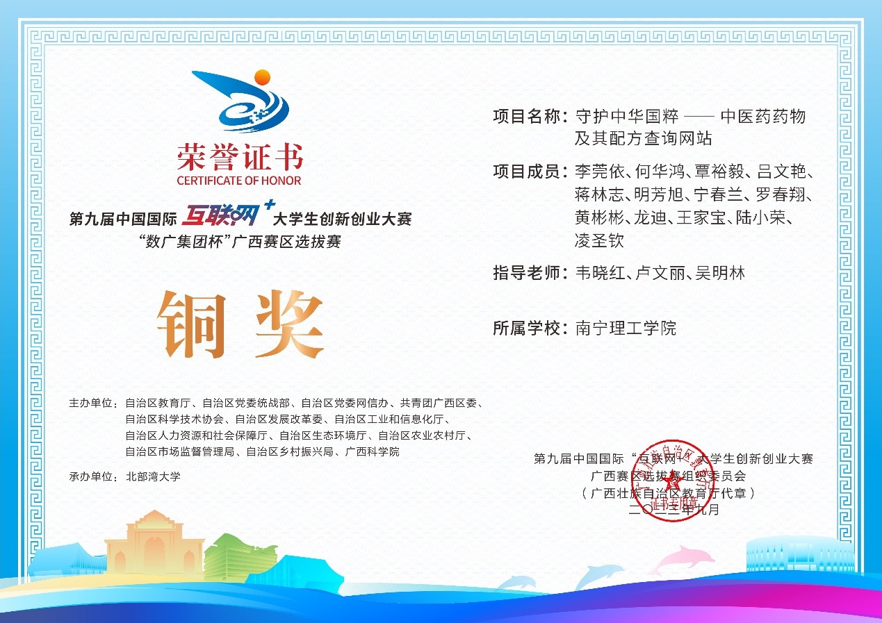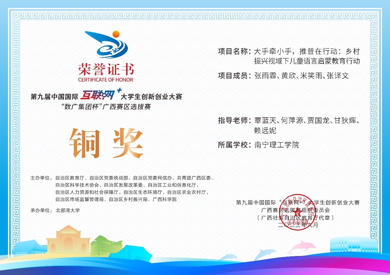 近日,第九届中国国际互联网+大学生创新创业大赛“数广集团杯”广西赛区选拔赛获奖奖状公布,我校参赛团队在高校主赛道中银奖2项,铜奖20项,红旅赛道中铜奖2项,共计24项。本届大赛以“我敢闯,我会创”为主题,大赛于今年8月全面启动。自开赛以来,南理学子以自己的专业知识和积极态度,凭借着自身的努力,突破重重障碍,荣获佳绩。