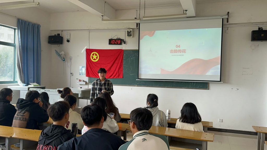 上午9点,同学们在教室里参与了团日活动会议,团日活动在观看《建军大业》《建党伟业》电影中拉开序幕,并挑选团员上台分享了观影感想。其次还有击鼓传花、分享红色故事的小游戏。最后,我们一同合唱了《强军战歌》来结束此次有意义的团日活动。