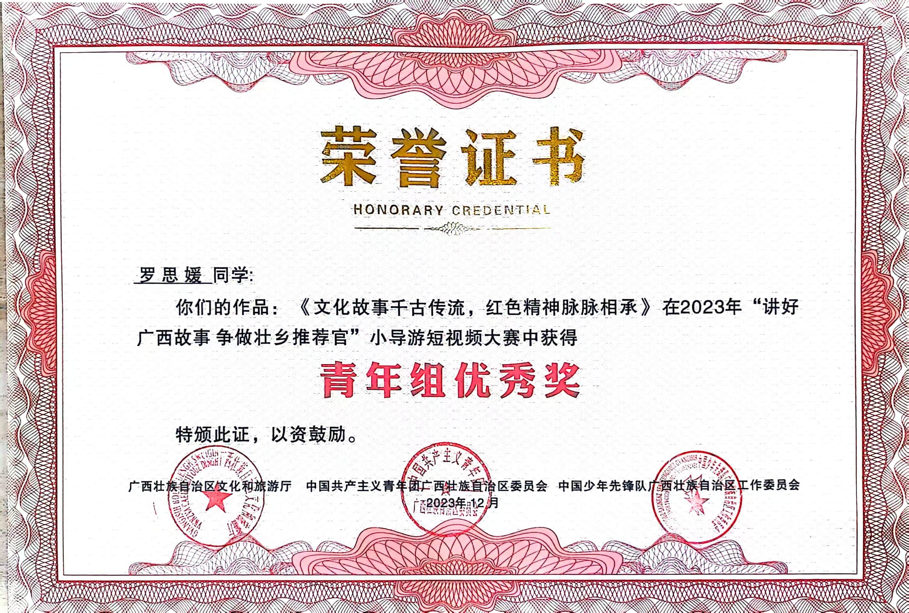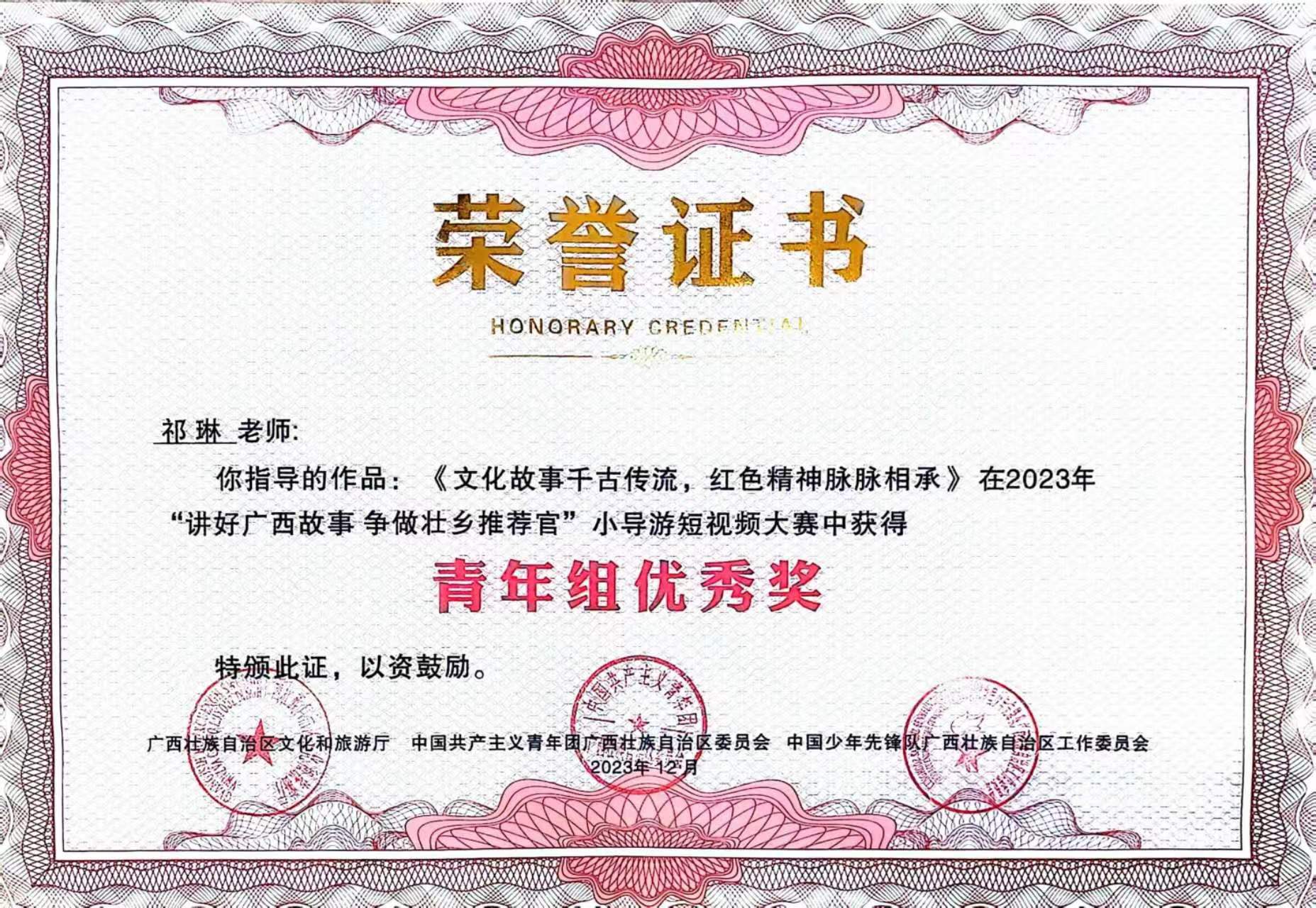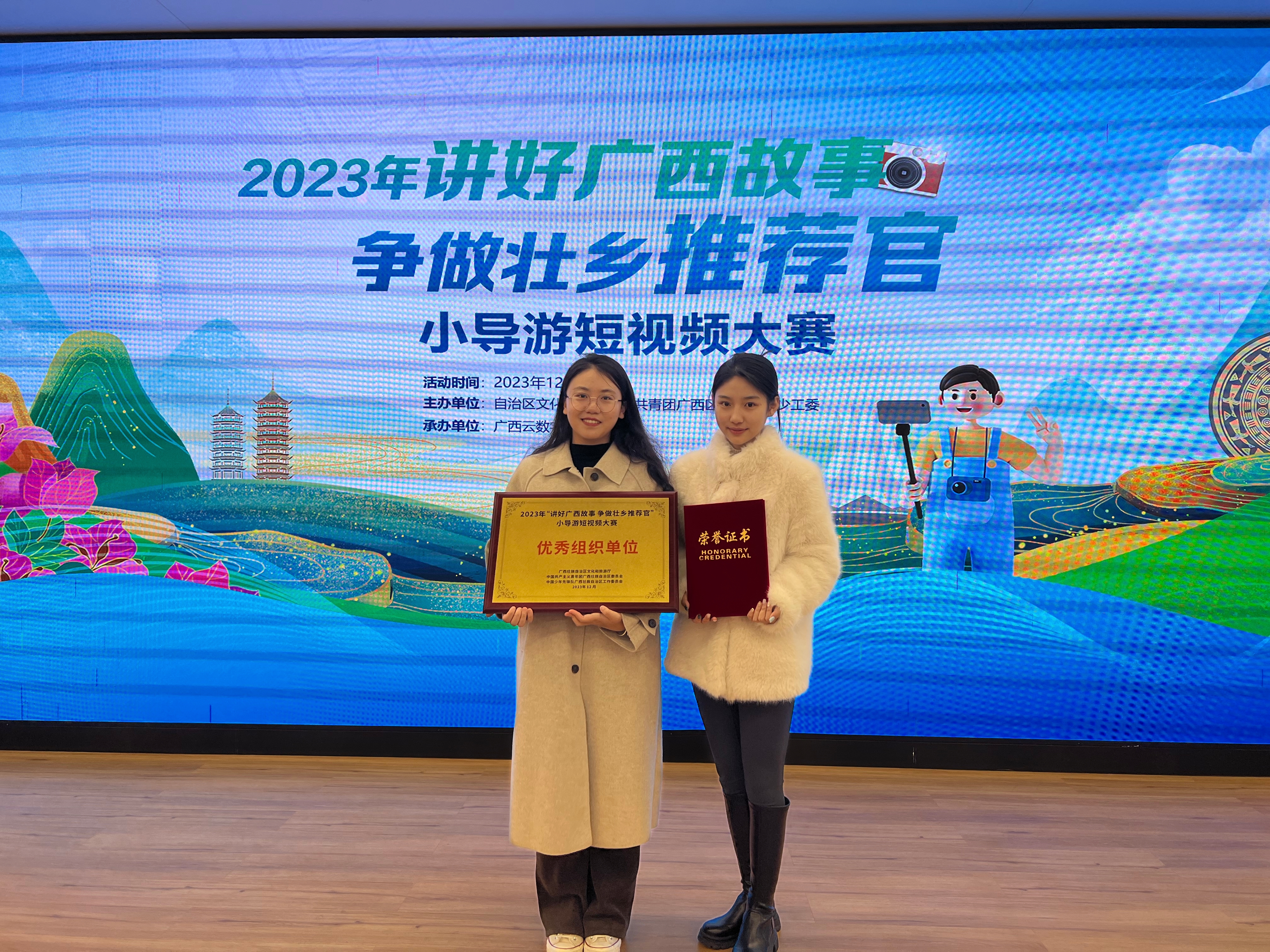 为了宣传广西的魅力和推动文化发展,广西教育厅和广西文化和旅游厅共同举办了“讲好广西故事,争做壮乡推荐官”小导演短视频大赛。大赛中我校共收到全校学生作品52件,审核筛选推荐18件学生作品参赛。参赛者们在创作过程中将深入了解广西的历史、地理和民俗文化,通过摄影技巧、剪辑手法和音效等手段,将自己对广西的理解和热爱通过影像的形式传递给观众,为广西的推广和宣传增添了新的力量。我校荣获优秀组织奖,黎秋萍、张笑言、祁琳老师荣获优秀指导老师奖,蒋林颖同学荣获青年组三等奖、许月露、罗思媛同学荣获青年组优秀奖。