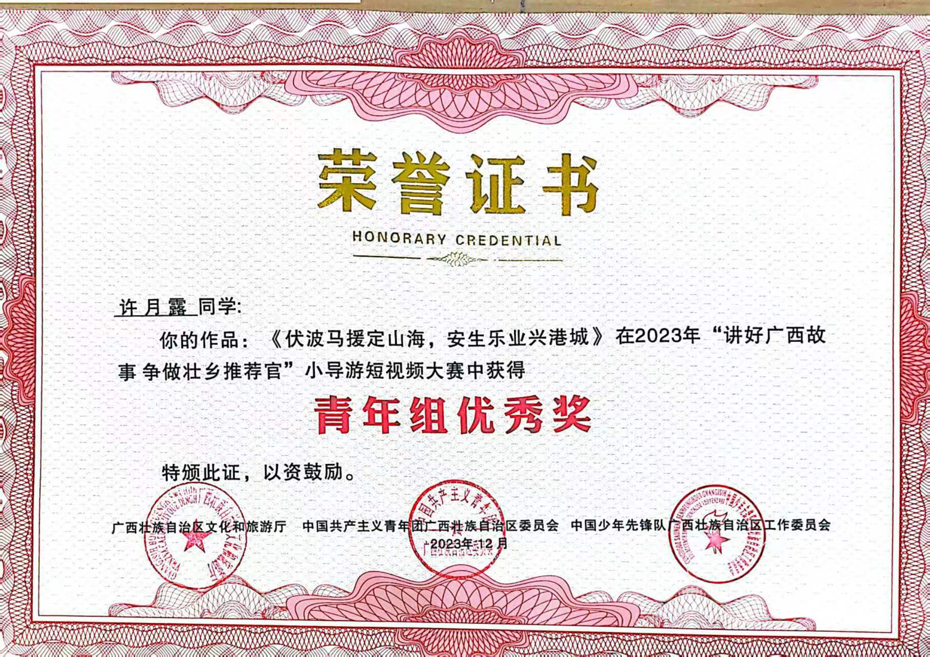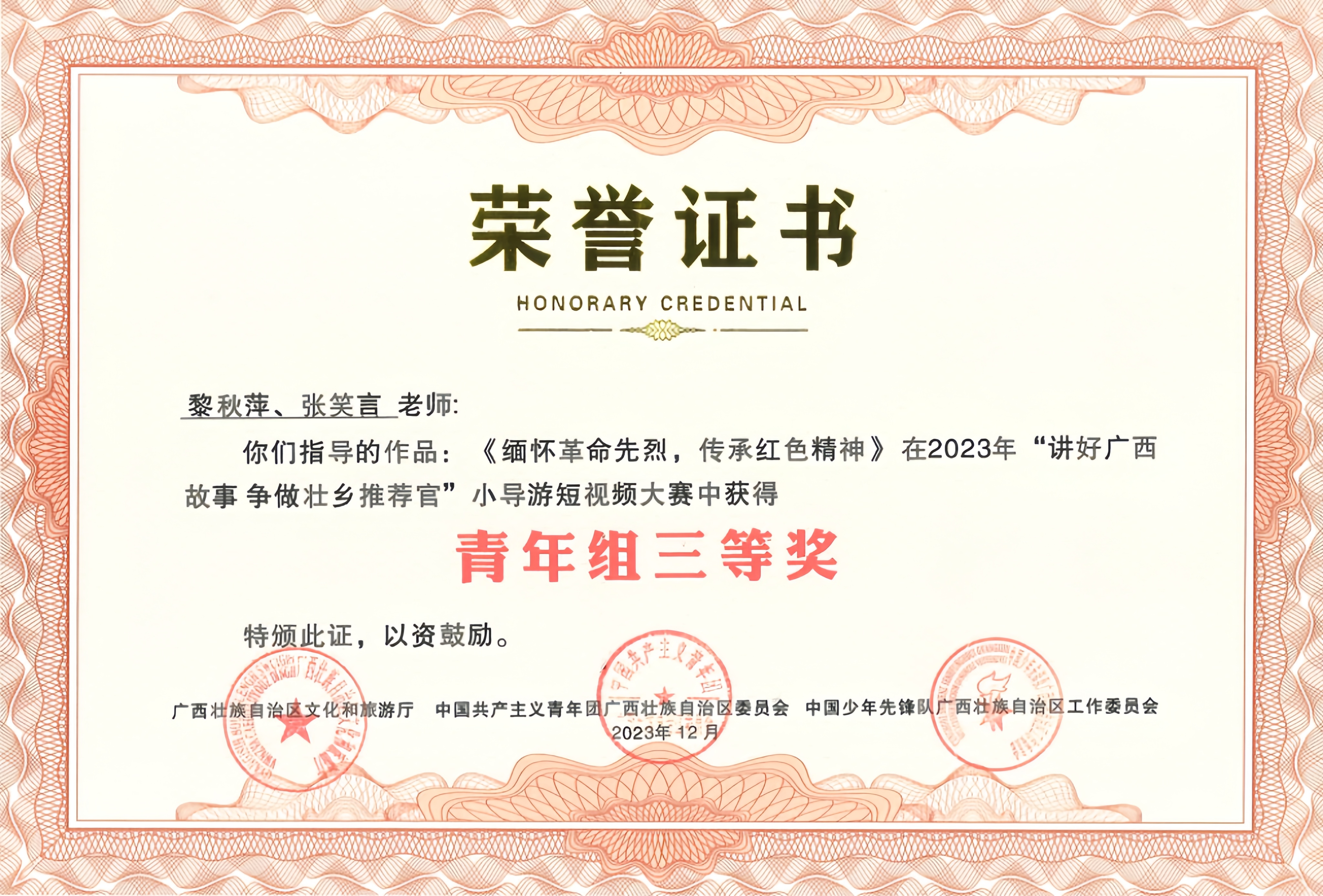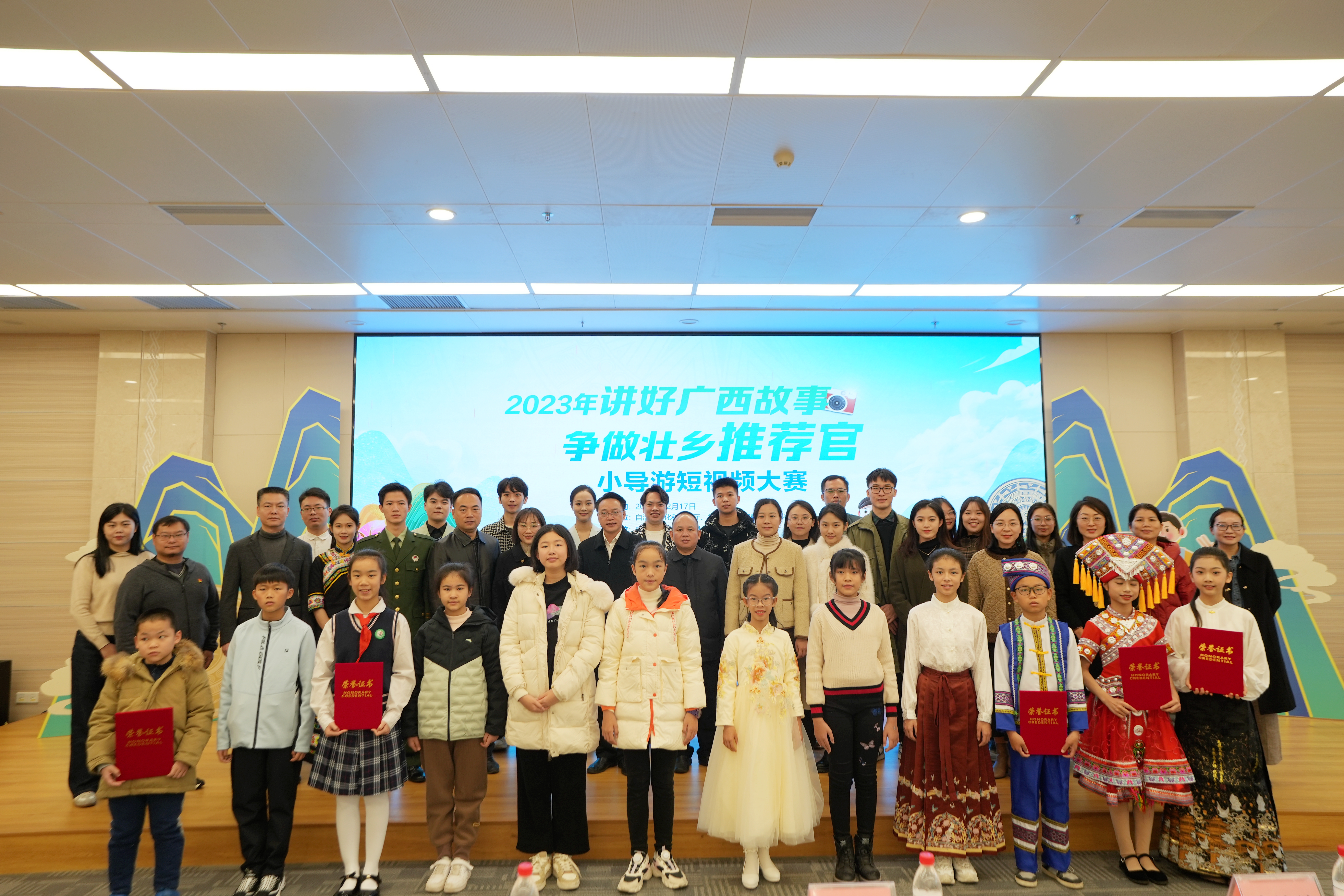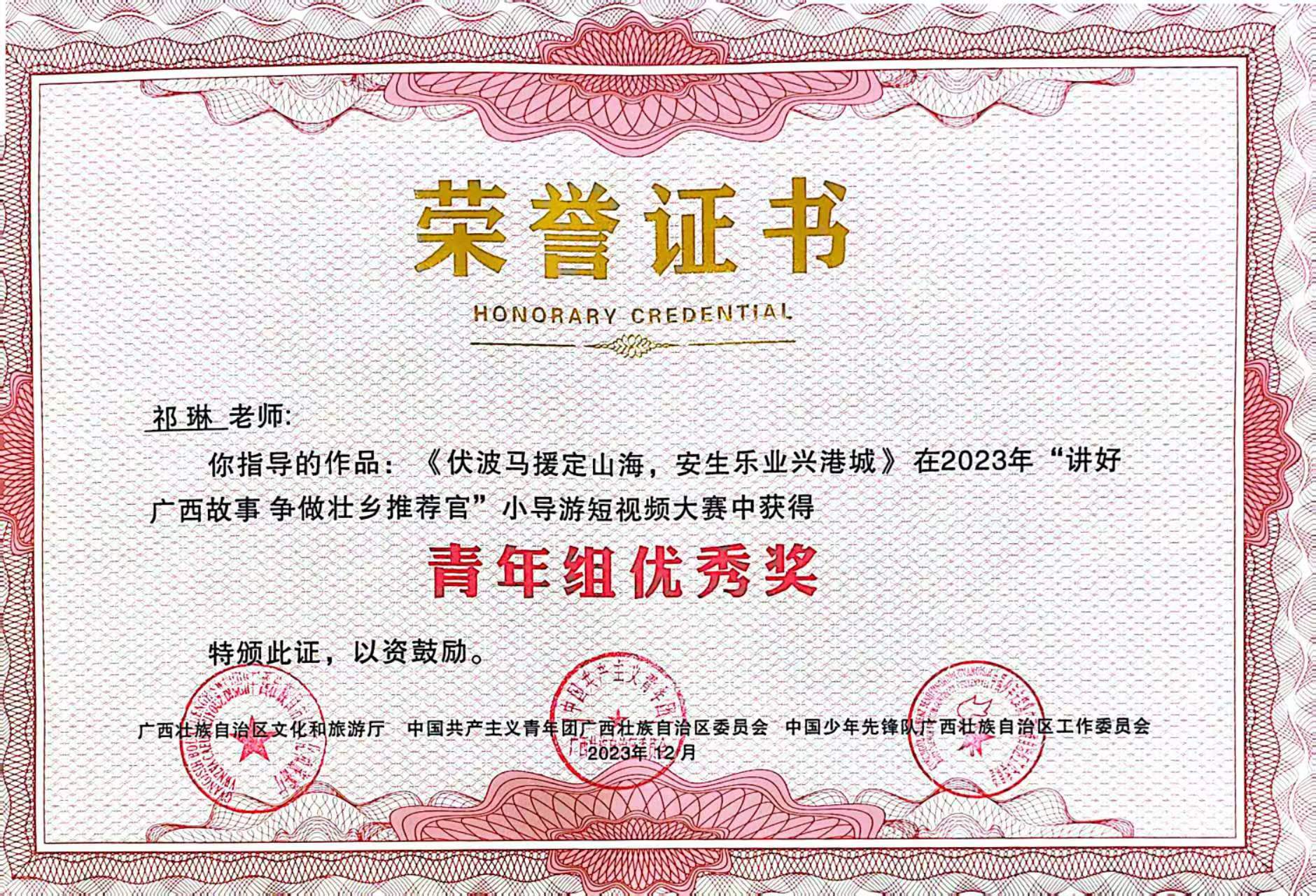 为了宣传广西的魅力和推动文化发展,广西教育厅和广西文化和旅游厅共同举办了“讲好广西故事,争做壮乡推荐官”小导演短视频大赛。大赛中我校共收到全校学生作品52件,审核筛选推荐18件学生作品参赛。参赛者们在创作过程中将深入了解广西的历史、地理和民俗文化,通过摄影技巧、剪辑手法和音效等手段,将自己对广西的理解和热爱通过影像的形式传递给观众,为广西的推广和宣传增添了新的力量。我校荣获优秀组织奖,黎秋萍、张笑言、祁琳老师荣获优秀指导老师奖,蒋林颖同学荣获青年组三等奖、许月露、罗思媛同学荣获青年组优秀奖。