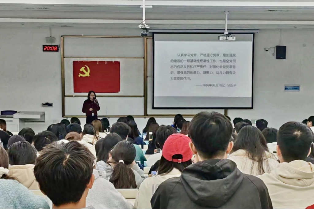 梁老师以习近平总书记在党的二十大讲话为切入点,从“党章的概述”、“党章的发展历程”、“党章第一章党员部分”、“党章第二章党组织部分”、“学习践行党章,争做合格党员”五个方面进行讲解,结合青年大学生黄文秀、陈仁军等具体事例勉励学生们要将党章学习成果转化为推动学习、工作的强大动力,起到模范带头作用,为实现中华民族伟大复兴的中国梦而不懈奋斗。