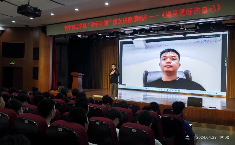 为了引导我院学子正确看待社会创业就业,鼓励我校学子创业就业实践,提高就业竞争力,4月29日19:00,特邀信息工程学院2005级优秀校友陈伟红(现任深圳汉基实业有限公司总经理、南宁理工学院广东校友会深圳分会会长,在校期间曾担任校团委副书记、桂林理工大学主持人队队长等。在校期间获得优秀学生干部、优秀毕业生等荣誉。)学长在1626报告厅开展“牵手计划”校友讲座第8讲,以《遇见更好的自己》为主题的讲座。参加本次讲座的有信息工程学院分团委书记王辉、辅导员张迷迷老师、梁庆阳老师、苏桂英老师和400多名学生观众。