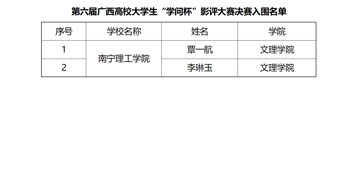 2024年5月21日,由广西高教学会图书馆专业委员会和广西高校图书情报工作指导委员会主办的“礼敬中华传经典,培根铸魂育新人”第六届广西高校大学生影评大赛决赛入围名单已揭晓。经过激烈角逐,我校共有2位参赛者成功入围决赛,届时将通过电话联系入围同学确认参加决赛的相关事宜。决赛入围名单如下: