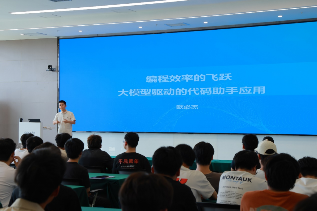 讲座上,欧必杰工程师首先介绍了当前人工智能领域中大模型的最新发展、大模型技术的基本概念及其在多个领域的成功应用,然后重点讨论了这项技术在代码助手开发中的作用。他指出,通过深度学习和大数据分析,大模型能够理解和预测编程逻辑,从而帮助开发者快速定位问题、生成代码片段,甚至进行代码优化。