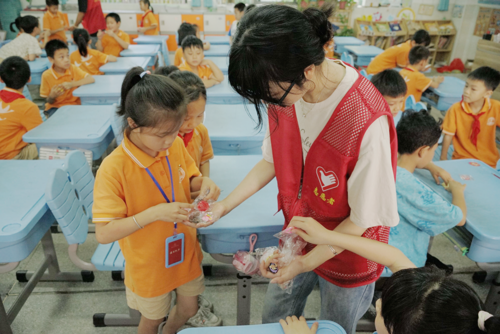 图为实践队成员为孩子们发放小礼品。通讯员 刘宇航 摄