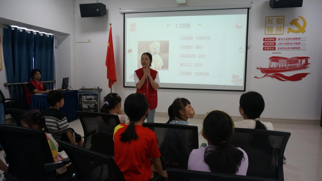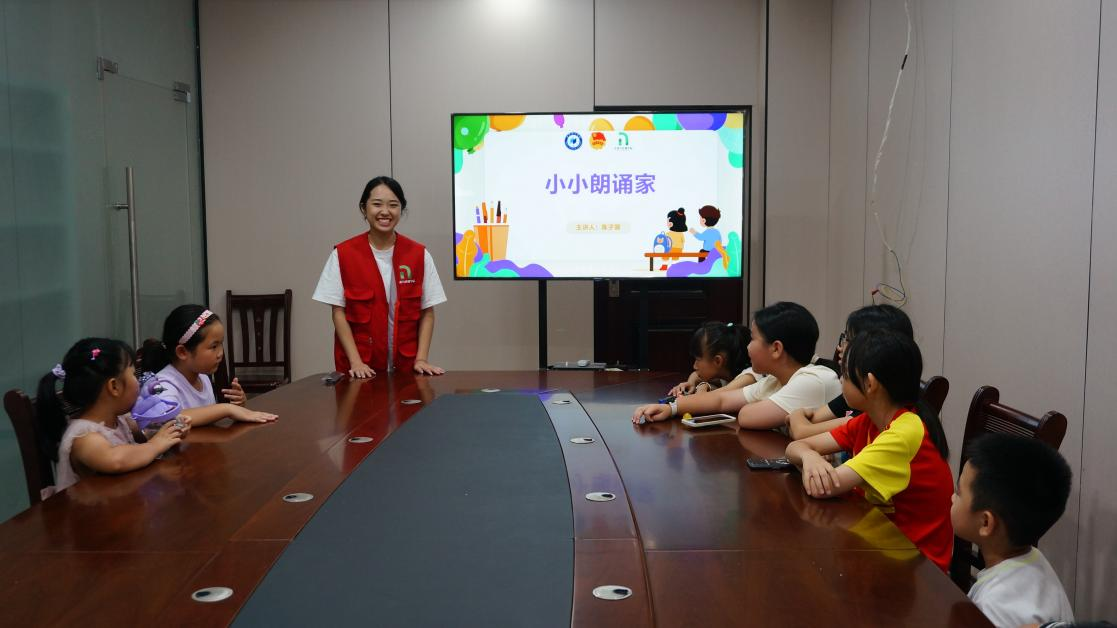 (团队成员陈子馨为孩子们讲解朗诵稿件)