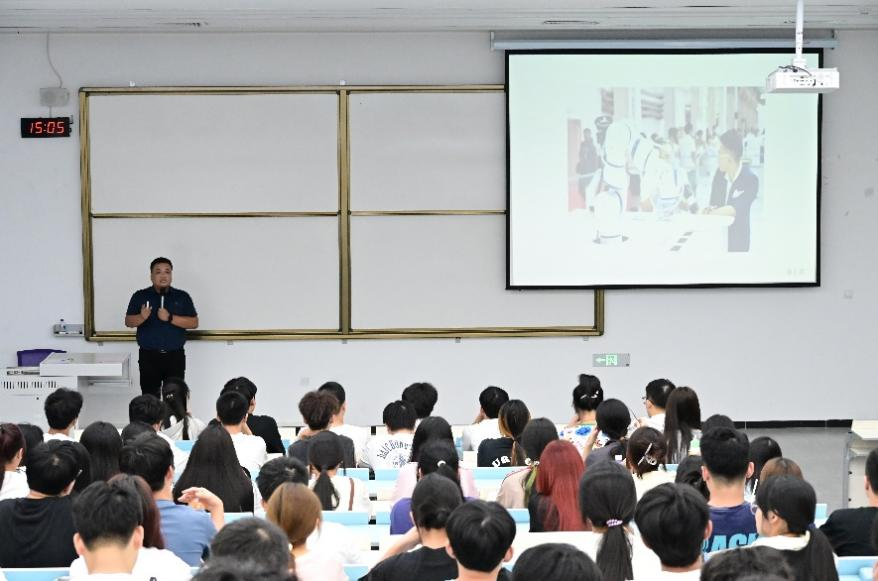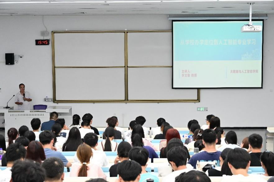 随后,李文敬教授以“从学校办学定位到人工智能专业学习”为题,向新生们介绍了学校概况以及如何开展人工智能领域的研究工作。李教授通过展示论文和专利等研究成果,鼓励新生们积极参与科研活动,通过实践不断提升自己的专业技能和创新能力。