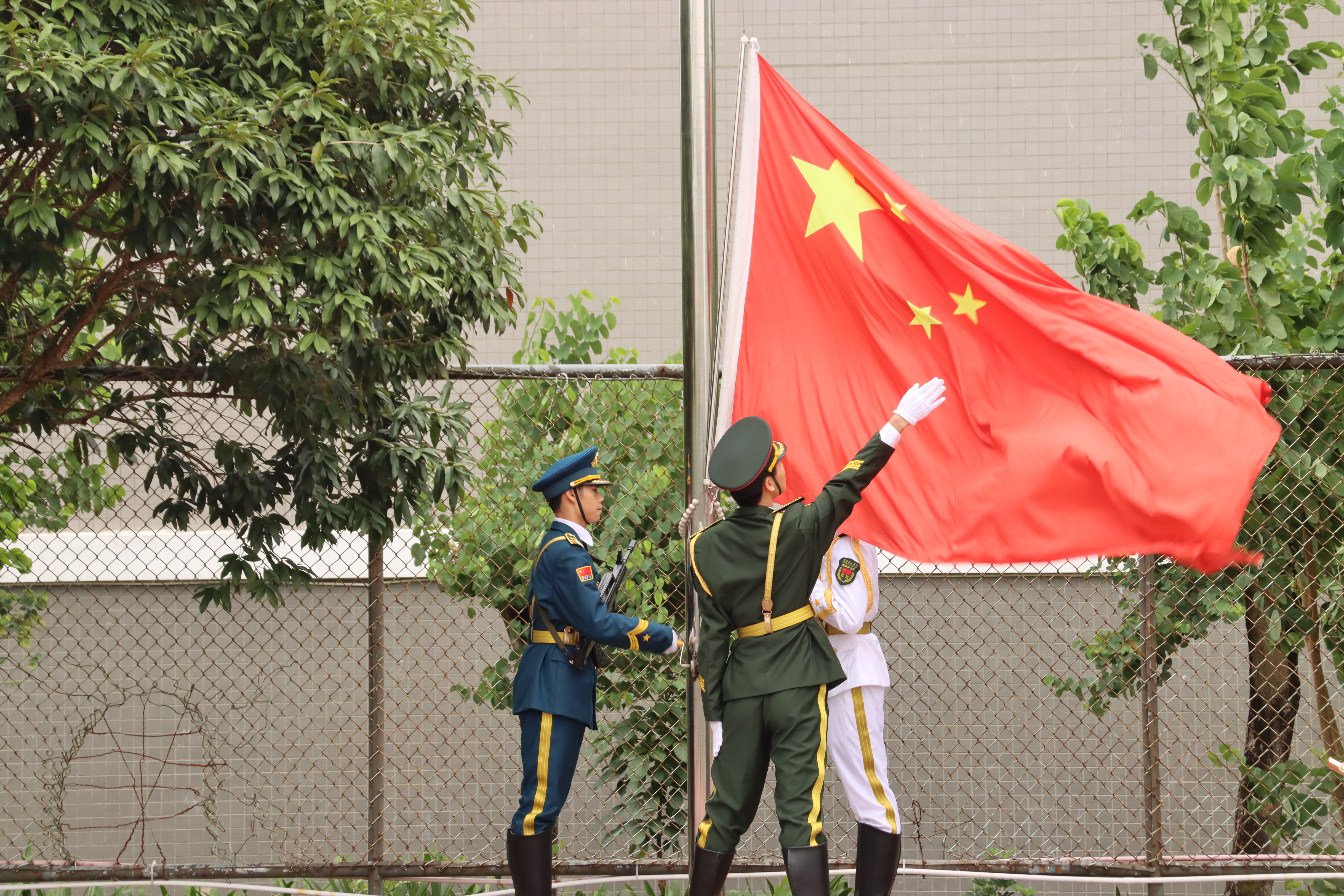 上午8时整,升旗仪式正式开始。国旗护卫队迈着坚定有力的步伐,庄严地护送五星红旗正步走向旗杆。他们着装整齐、步伐稳健,用赤子之心与铁血毅力展示了国旗风采。伴随着雄壮有力的《义勇军进行曲》,鲜艳的五星红旗冉冉升起,迎风飘扬。现场全体师生高唱国歌、行注目礼,为伟大祖国送上最诚挚的祝福。