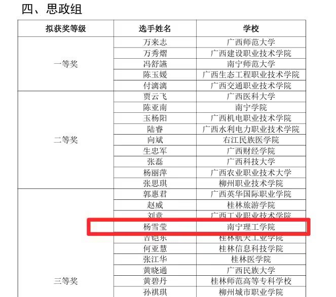 为加强高校青年教师队伍建设,推进提升青年教师专业能力和业务水平,近日,由广西壮族自治区教育厅、广西壮族自治区总工会主办,广西师范大学承办的第十届广西高校青年教师教学竞赛决赛在广西师范大学育才校区举行,来自全区58所高校的134名选手参赛。我校马克思主义学院教师杨雪莹荣获思政组三等奖。