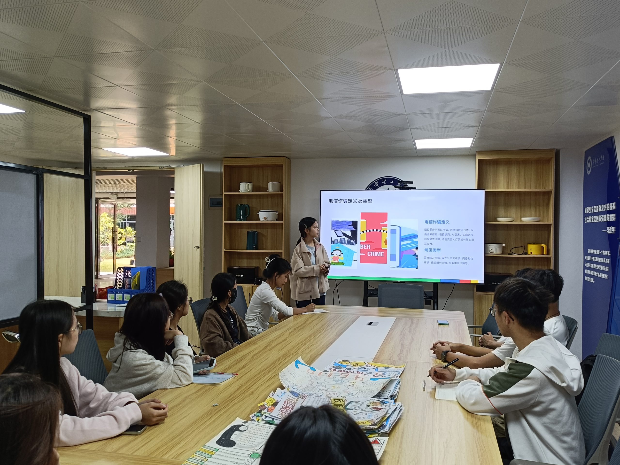 活动开场,杨玲同学便以一系列令人触目惊心的电信诈骗真实案例牢牢抓住了在场同学们的目光。她抽丝剥茧般地详细拆解了网络购物诈骗、兼职刷单诈骗、冒充电商客服退款诈骗等常见骗术的作案流程,生动且清晰地呈现出诈骗分子是如何精心布局、环环相扣,从而一步步将受害者引入陷阱的狡猾手段。