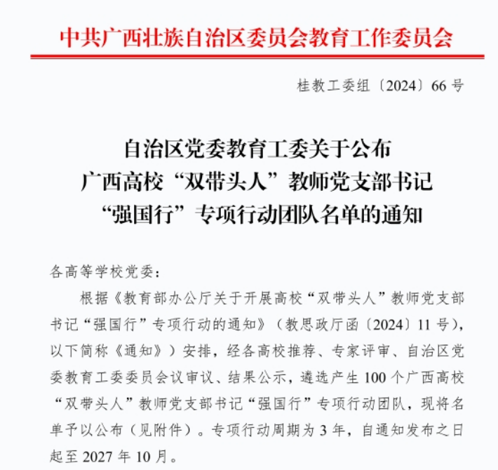近日,广西壮族自治区党委教育工委发布《关于公布广西高校“双带头人”教师党支部书记“强国行”专项行动团队名单的通知》,我校2个党支部成功入选自治区级“强国行”专项行动团队,入选团队数量位于全区民办高校首位。