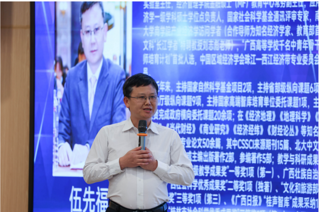 广西师范大学经济管理学院副院长,广西高校数字赋能经济发展重点实验室主任,博士生导师,国家社会科学基金通讯评审专家伍先福教授,在会上分享了题为《金融支持绿色低碳转型的理论逻辑与政策支撑》的学术心得。伍教授凭借其深厚的学术造诣和丰富的实践经验,深刻阐述了金融支持在推动绿色低碳转型中的理论逻辑基础,并详细探讨了实现这一转型所需的政策支撑体系。他的分享不仅为参会者揭示了金融支持绿色低碳发展的内在机制,还为制定和完善相关政策提供了有力的理论依据和实践指导,赢得了与会者的广泛赞誉与深刻思考。