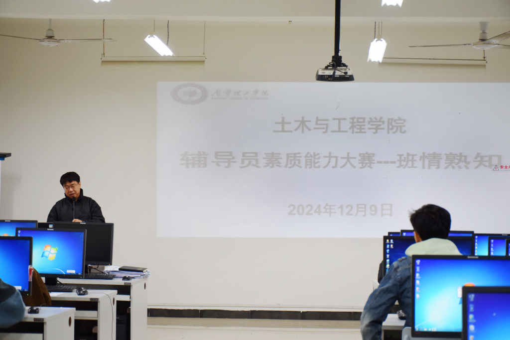 为进一步提升土木与工程学院辅导员队伍的业务能力和工作水平,促进辅导员熟练掌握班级和学生情况,推动辅导员队伍建设工作高质量发展,12月9日上午,我院在2307机房举办了2024年辅导员素质能力大赛班情熟知环节。我院全体辅导员参加此次比赛,学院党总支书记秦磊出席并主持活动。