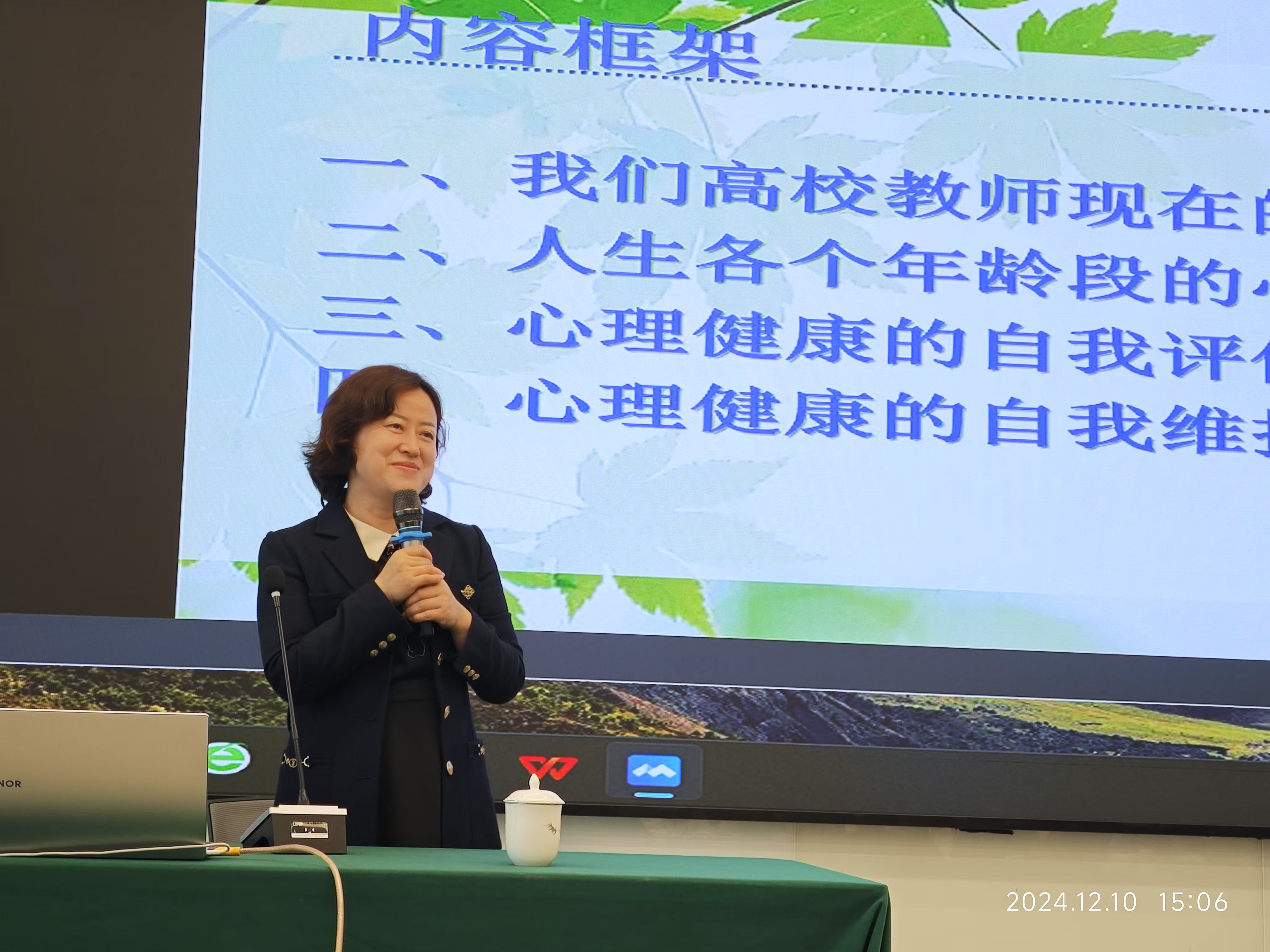讲座中,付教授以其专业的视角和丰富的经验,深入剖析了影响高校教师心理健康的主要因素,并详细阐述了健康与心理健康的标准。同时,她还介绍了心理健康问题与心理异常的评估原则与技术,以及压力应对和情绪调节的自我调适技术。
