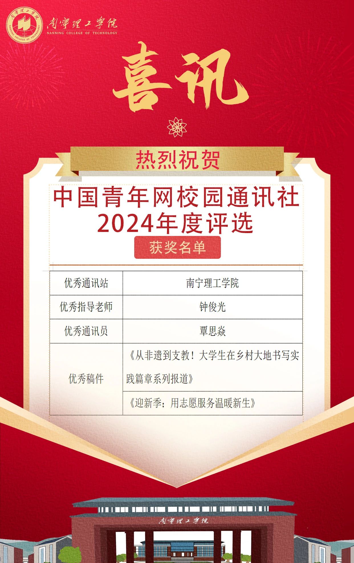喜讯|南宁理工学院在中国青年网校园通讯社2024年度评选中荣获佳绩