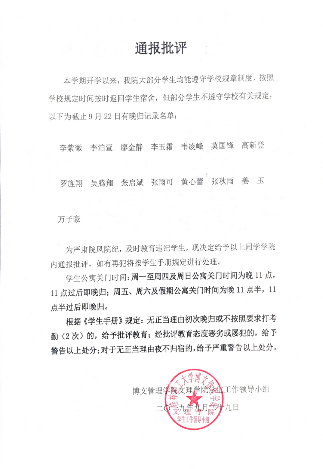 关于给予以下同学院内通报批评的决定