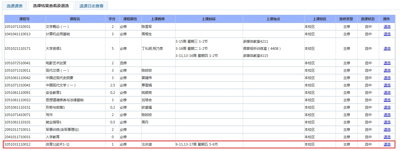 方法1:在选课界面下方“选课结果查看及退选”中查看选课状态,显示已选体育课程即为成功,以选择汪庆谊老师的武术为例,如图: