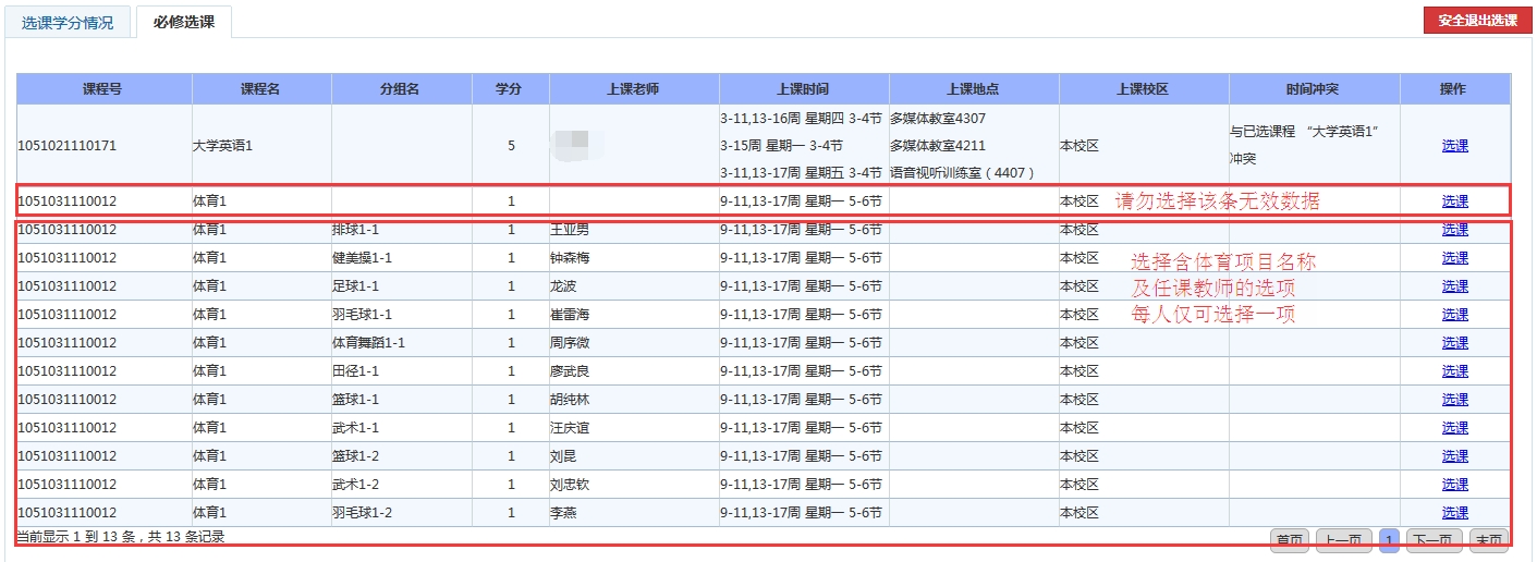 2.选课时请注意,请勿选择未显示体育项目名称及教师的数据(会提示选课失败),需选择含体育项目名称及教师的选项才有效,每人仅可选择一项,如图: