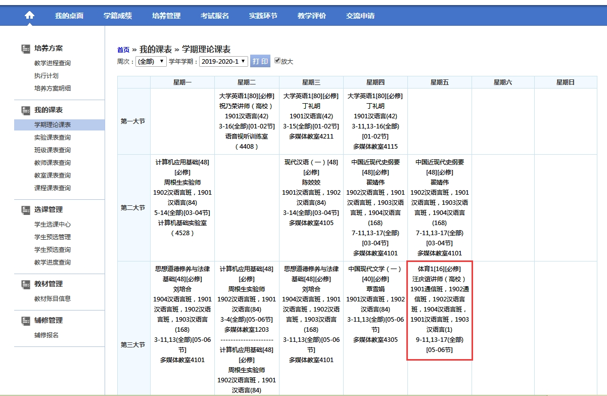 方法2:通过查看学期理论课表,核对已选体育课程教师姓名是否在课表中显示,如显示即为成功。以选择汪庆谊老师的武术为例,如图: