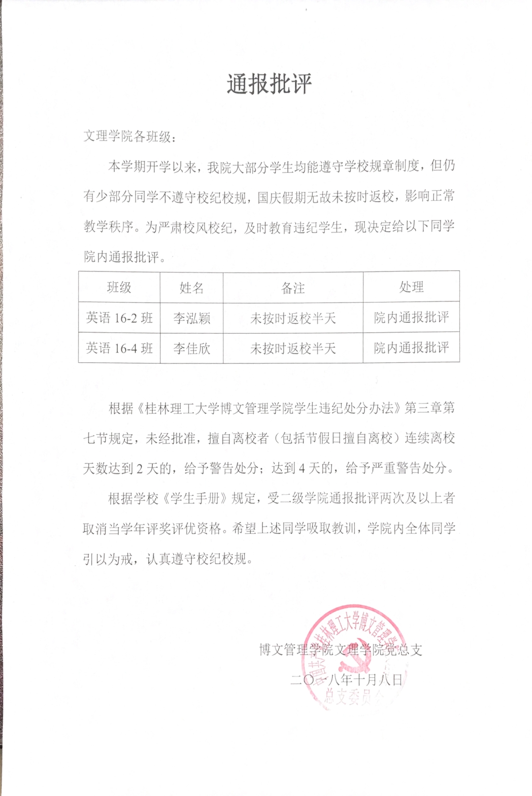 关于给予李泓颖、李佳欣同学院内通报批评的决定