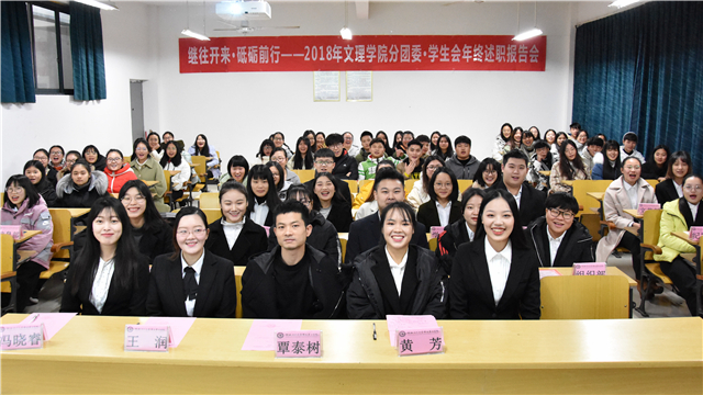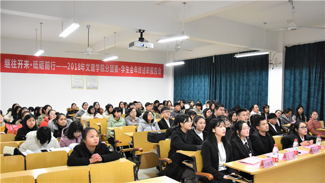 为进一步加强和改进我院分团委·学生会的各项工作,回顾分团委·学生会一年以来的工作情况,总结经验,表彰先进, 展望未来,不断增强学生干部队伍凝聚力和战斗力,提高团组织文化建设,促进团学干部队伍科学化建设,提升校园文化活动建设内涵。2019年1月2日晚,在4228教室召开“继往开来,砥砺前行”为主题的2018年文理学院分团委•学生会年终述职报告会。文理学院分委·学生会全体成员参加此次报告会。此次报告会由文理学院分团委·学生会副书记吴雨涵主持。