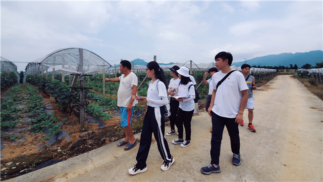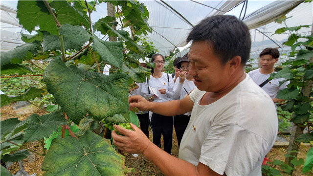 兴安县五甲村位于兴安县溶江镇西南部,全村有13个自然村12个村民小组,共614户2167人。在五甲村村委书记张雪峰的带领下,社会实践团成员来到了“错峰”葡萄种植基地。张书记一手打造了“错峰”葡萄这一品牌。张书记就任五甲村村委书记后,凭借精湛的葡萄种植技术,带领村民种植葡萄脱贫致富。