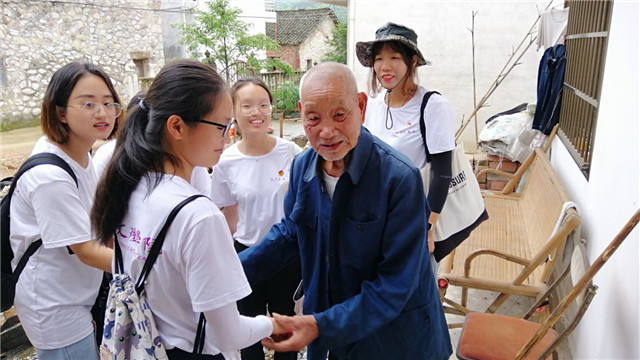 社会实践团在粉洞村委座谈时,蒋文杰书记给我们拿出了3本笔记本,笔记本上记满了村民们的建议,蒋书记跟我们介绍说:“粉洞村每年有13名干部住村开展“新三同”活动,在大家的共同努力下,粉洞内道路硬化拓宽了,人畜饮水接到了家门口,产业路修好了,村村通上了太阳能路灯。”通过调研社会实践团了解到,以前粉洞村饮水都是从山上引水,全村1000多人,大大小小接了几十根管子,每年还有三分之一的时间缺水。粉洞村在2017年4月底,村两委找来专业团队帮粉洞村找了水源,同年9月,粉洞村家家户户接上了自来水。社会实践团了解到粉洞村有一名百岁的老党员候永智爷爷,我们在“第一书记”的带领下来到了候爷爷家里,候爷爷看到我们的到来感动很高兴,候爷爷今年9月就要满百岁了,虽然耳朵听得不是很清楚,但是候爷爷身体还是很硬朗,同候爷爷围坐,他跟我们讲起了党的历史,谈起红军长征、到新中国成立、在到党一路走来的风雨。