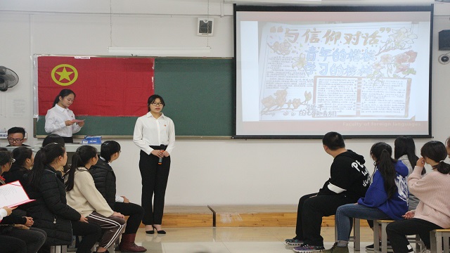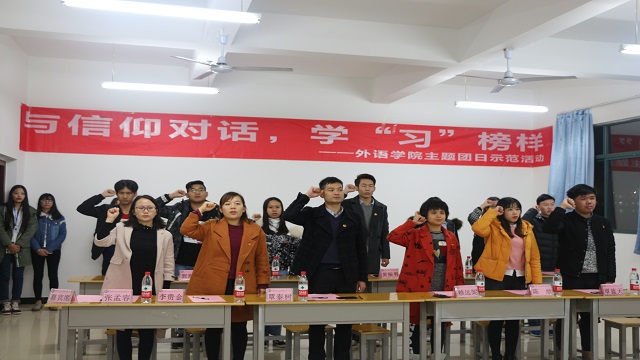 为深入贯彻落实“一学一做”教育实践活动常态化制度化建设,在我校广大青年学生和各级团学组织中掀起学习习总书记《知青岁月》的热潮,引领广大青年学生学思、践、悟习近平总书记青年时期的成长故事,以奋发向上、团结一心的精神状态深入贯彻学习党的十九大精神,11月30日晚6:30,我院分团委于教一栋1307教室开展了以“与信仰对话,学‘习’榜样”为主题的团日示范活动。出席本次团日活动的嘉宾有外语学院党总支副书记赖远妮,外语学院分团委书记覃泰树,经济与管理学院辅导员李贵金,土木与工程学院辅导员陈欣,建筑与设计学院辅导员张孟容,外语学院辅导员覃以及校团委、各二级学院分团委学生副书记,外语学院17级学生参加此次活动。