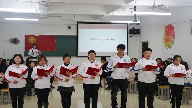 活动伊始,全体师生观看视频《公仆之路》,该视频清晰叙述了习近平总书记青年时期的工作历程,讲述了一代领导人的成长成材之路;紧接着由17级各团支部展示主题手抄报,同学们通过手绘作品畅聊对“青年榜样”的理解;随后的诗歌《知青》朗诵中,我院17级七位同学铿锵有力的声音为我们讲述着知识青年上山下乡的故事,即是歌颂,也是赞美;紧随其后的游戏环节不失外语特色,十九大热词翻译将整场活动带入高潮,同学们积极参与,活动现场气氛活跃;其后在主持人的带领下,全体师生起立重温入团誓词。活动最后,赖远妮老师对本次团日示范活动进行了细致地点评,在一阵阵热烈掌声中,此次团日活动圆满落下帷幕。