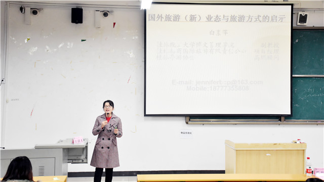 讲座伊始,覃泰树老师向同学们简要介绍主讲人副教授。随后讲座正式开始,副教授从旅游(新)业态概述、世界一些国家代表性休闲农业发展模式、各国民宿经营模式面面观、英语专业VS职场关系四个方面分享跨国旅游方面的内容;从商务旅游业、文化娱乐旅游业、邮轮旅游业等六个方面介绍新型旅游业态;从商、养、学、闲、情、奇六个方面讲述新型旅游要素;从劳动生产率、经济、交通运输技术三个方面讲解推动世界旅游业发展的关键因素;从主题式度假、生态健康式度假两个方面讲述旅游业发展现状的多元化。通过列举英国、美国等国家的旅游业发展状况来突出介绍休闲农业发展模式,并介绍世界旅游发展新趋势、特点、启示及各国民宿经营模式。最后,副教授向同学们讲述英语专业和职场之间的微妙关系,并通过详细介绍旅游翻译、国际港航空服务和旅游体验师等相关职业进一步说明此关系。白副教授幽默诙谐又不失严谨的话语为本次讲座营造了良好的氛围,并通过丰富的案例进行生动地讲解,赢得了在场学生的阵阵掌声。