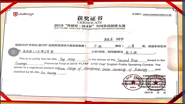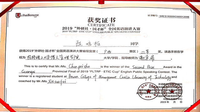 【喜讯】我校学子在2019年“外研社•国才杯”全国英语演讲大赛中喜获广西赛区二等奖