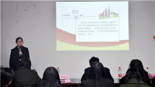 为进一步加强和改进我院分团委·学生会的各项工作,回顾分团委·学生会一年以来的工作情况,总结经验,表彰先进,不断增强学生干部队伍凝聚力和战斗力,提高团组织文化建设,促进团学干部队伍科学化建设,提升校园文化活动建设水平。2018年1月3日晚19点30分在2205教室召开“不忘初心,砥砺前行,共创外院共青团工作新局面”为主题的2017年外语学院分团委•学生会年终述职报告会。出席本次报告会的嘉宾有外语学院分团委书记覃泰树。外语学院分委·学生会全体成员参加此次会议。