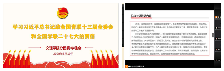 “我国广大青年要坚定理想信念,培育高尚品格,练就过硬本领,勇于创新创造,矢志艰苦奋斗,同亿万人民一道,在矢志奋斗中谱写新时代的青春之歌。”8月17日上午,中华全国青年联合会第十三届委员会全体会议、中华全国学生联合会第二十七次代表大会在京开幕。习近平总书记发来贺信,代表党中央,向大会的召开表示热烈的祝贺,向全国各族各界青年和青年学生、向广大海外中华青年致以诚挚的问候。我院积极组织分团委学生会、青年师生代表、学院各基层团支部学习习近平总书记贺信、观看全国青联十三届全委会、全国学联二十七大网络主题直播活动,掀起学习的热潮。