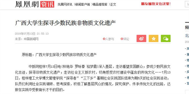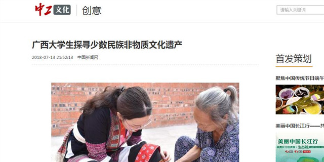 【文理实践】中国新闻网,凤凰网等多家权威媒体对我院“探寻者”暑期社会实践团队调研恭城瑶族传统文化进行报道