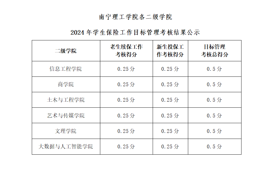 根据《南宁理工学院部门(单位)2024年度目标管理考核办法》的规定,按照学校各二级学院2024年度老生续保工作和新生投保工作的开展情况,现将全年学生保险工作目标管理考核结果公示如下;公示期3天。