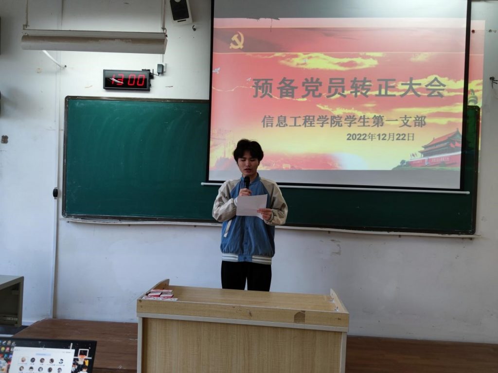 为规范扎实做好党员发展工作,12月22日,信息工程学院学生第一党支部于4105教室召开预备党员转正大会。大会讨论关于赵文川等十七名同志申请转为中共正式党员的相关事宜。本次会议经报党委批准,由支部书记粟方俞同志主持,支部全体党员参加大会。
