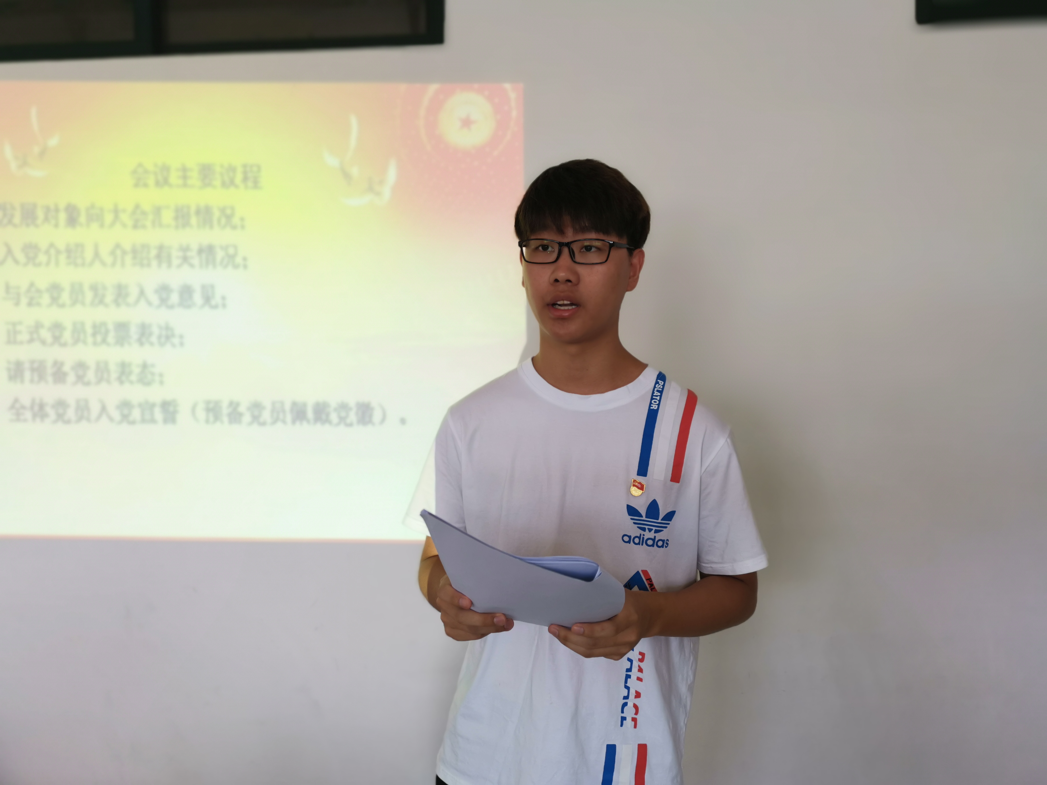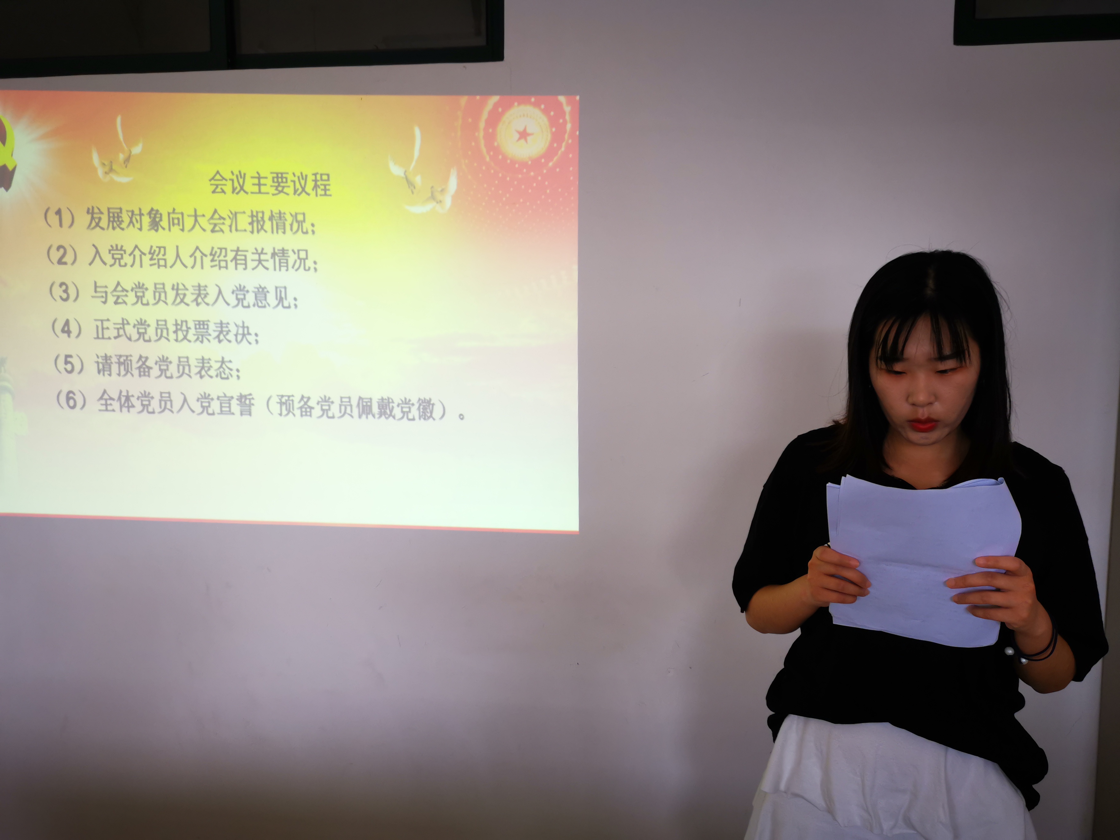 大会严格按照发展党员的相关程序进行。首先,是经过支部和上级党组织审查确定的尤敬佩、琳、朱佳荣、赖明圆、马翠翠、赵星、张校严、刘宣岑、牛存中、李东旭、庄坤、杨宇浩、范丹虹等13名发展对象依次向大会汇报自己对党的认识、入党动机以及自己现实表现等基本情况。紧接着,入党介绍人和与会党员对13名发展对象的入党问题发表了意见。随后,与会的各位党员进行匿名投票表决,大会一致同意接收尤敬佩等13名同志为中共预备党员。最后,支委成员为新党员佩戴党徽,与会党员一起重温入党誓词。