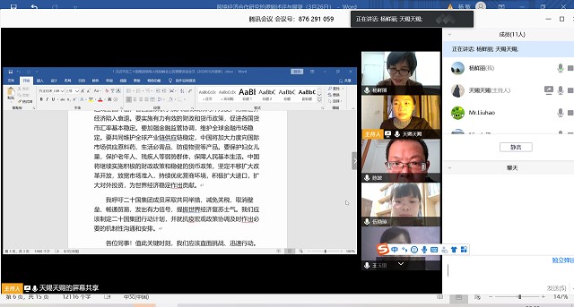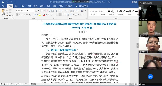 在“云党课”中,支部书记首先带领全体党员集中学习《习近平总书记在二十国领导人特别峰会上的发言,携手抗疫 共克时艰》和《习近平总书记在统筹推进新冠肺炎疫情防控和经济社会发展工作部署会议上的讲话》。支部书记表示习近平总书记强调,面对突如其来的新冠肺炎疫情,中国政府、中国人民不畏艰险,始终把人民生命安全和身体健康摆在第一位,按照坚定信心、同舟共济、科学防治、精准施策的总要求,坚持全民动员、联防联控、公开透明,打响了一场抗击疫情的人民战争;并在讲话中提到,秉持人类命运共同体理念,来应对目前疫情带来的健康问题;最后强调,值此关键时刻,我们应该直面挑战、迅速行动。我坚信,只要我们同舟共济、守望相助,就一定能够彻底战胜疫情,迎来人类发展更加美好的明天。
