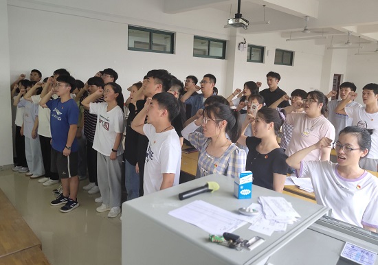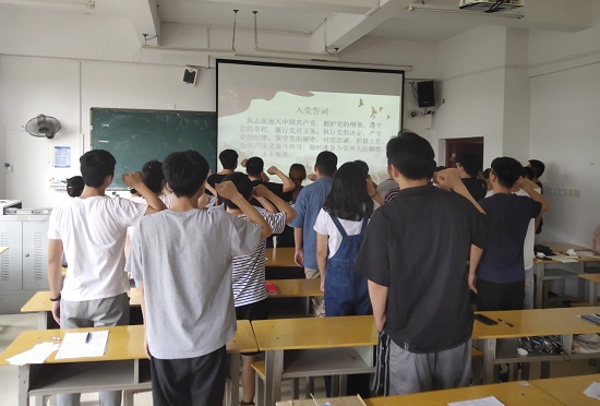 大会最后,与会党员给赵石鸿等24名预备党员佩戴党徽,并面向党旗,举起右手庄严宣誓。支部书记对此次大会进行了总结,她对新发展的24名同志表示衷心的祝贺并寄予殷切地希望,她希望大家能做到不忘初心、牢记使命,加强理论学习,提高自身修养,多了解党的历史,不仅要在行动上入党,还要在思想上入党,在学习、工作和生活中都能够起到模范带头作用。