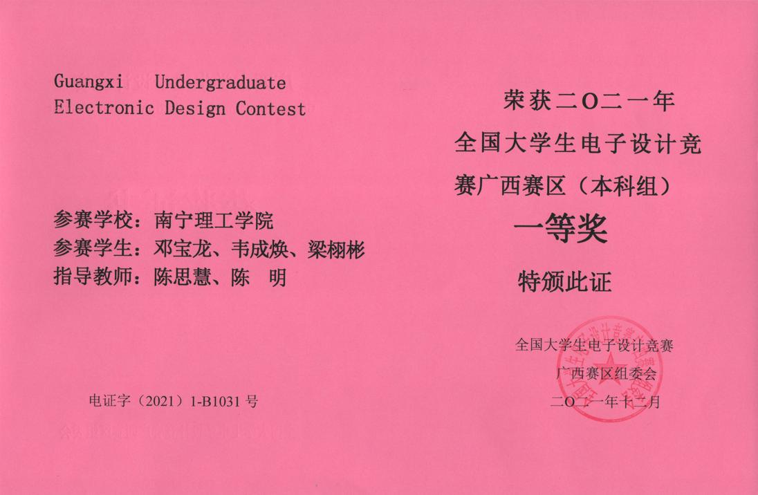 南理学子在2021年全国大学生电子设计竞赛中再创佳绩,参赛的信息工程学院代表队勇夺本届赛事本科组“全国二等奖”一项,“广西赛区一等奖”一项。