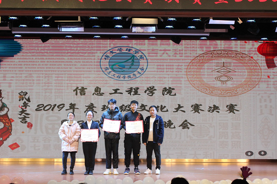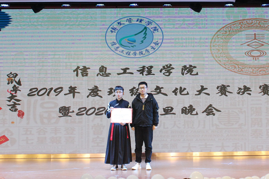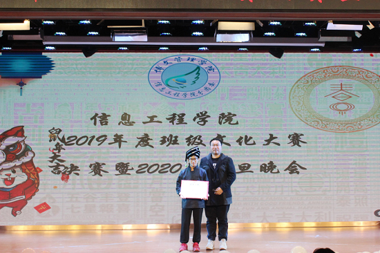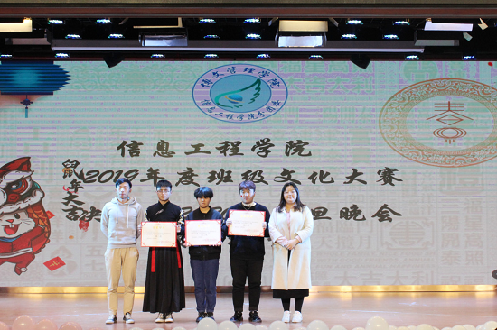 为了展现大学生风采,喜迎2020年的到来,加强爱国主义教育,12月27日晚,信息工程学院在一栋报告厅举办以“展青春风采 迎元旦佳节”为主题的班级文化比赛决赛暨元旦晚会。学院党总支副书记,分团委书记,各辅导员出席晚会;学院各年级学生代表及学校各学生组织代表参加晚会。